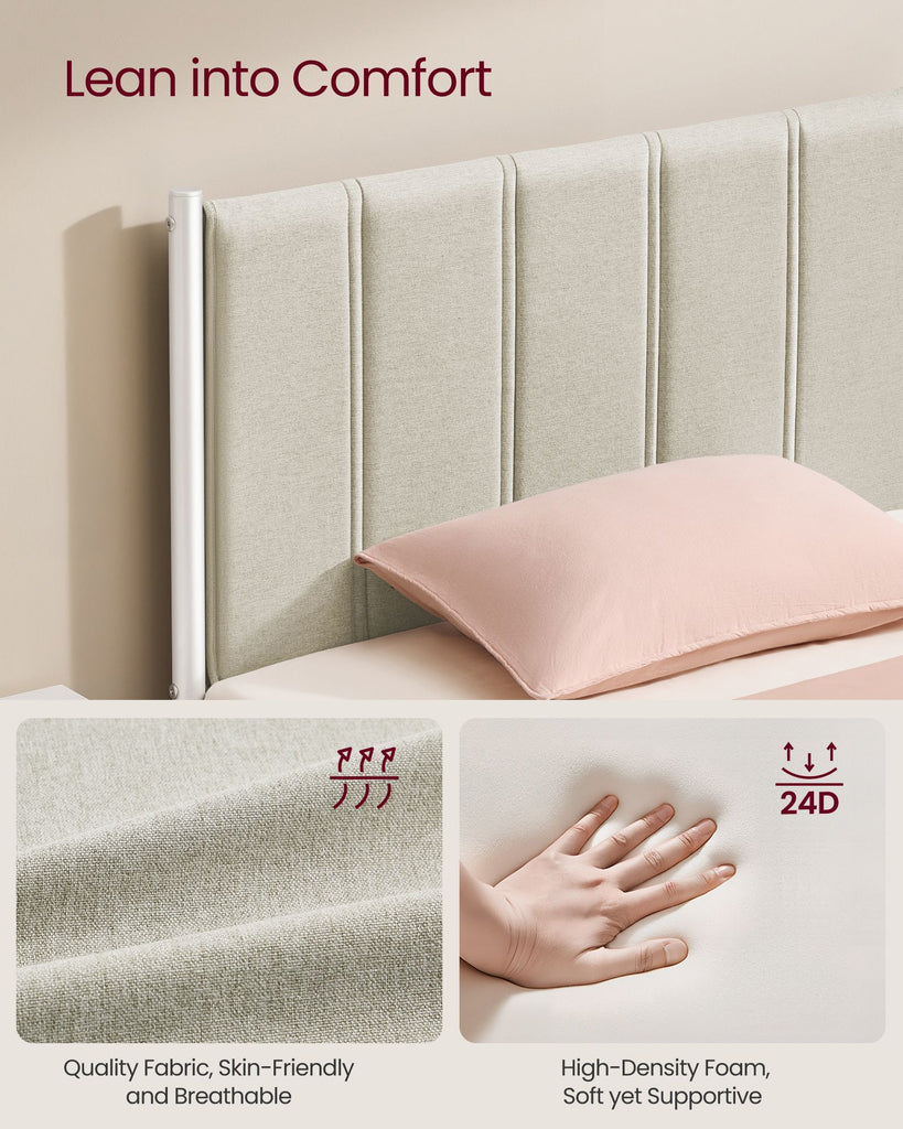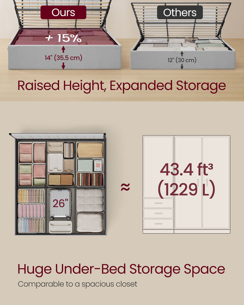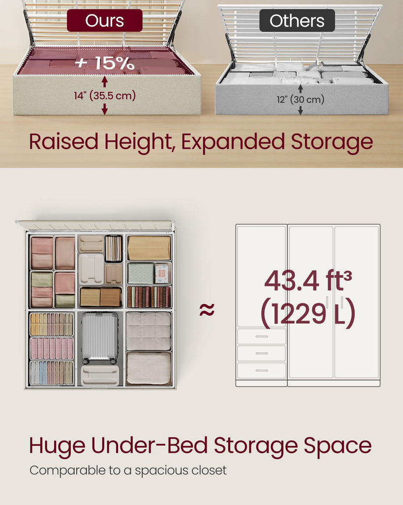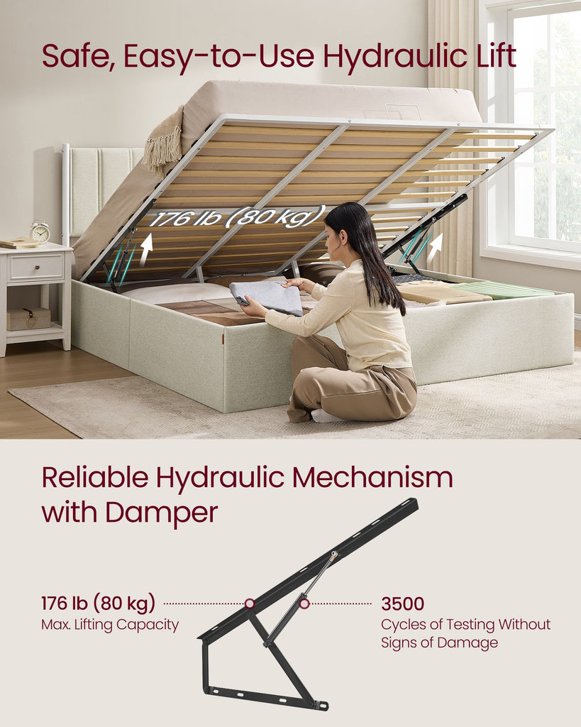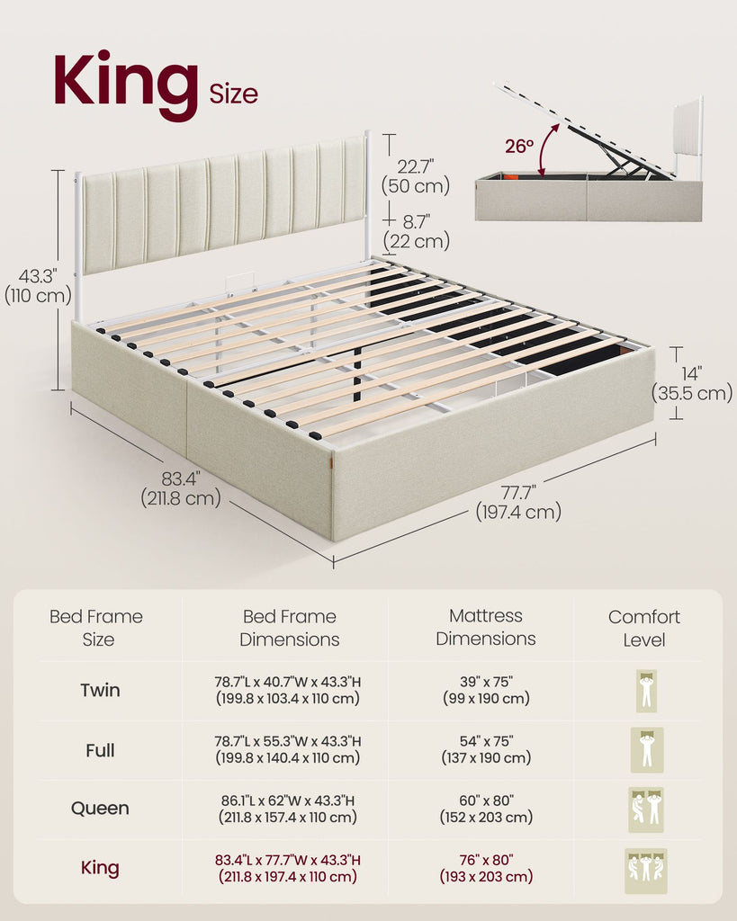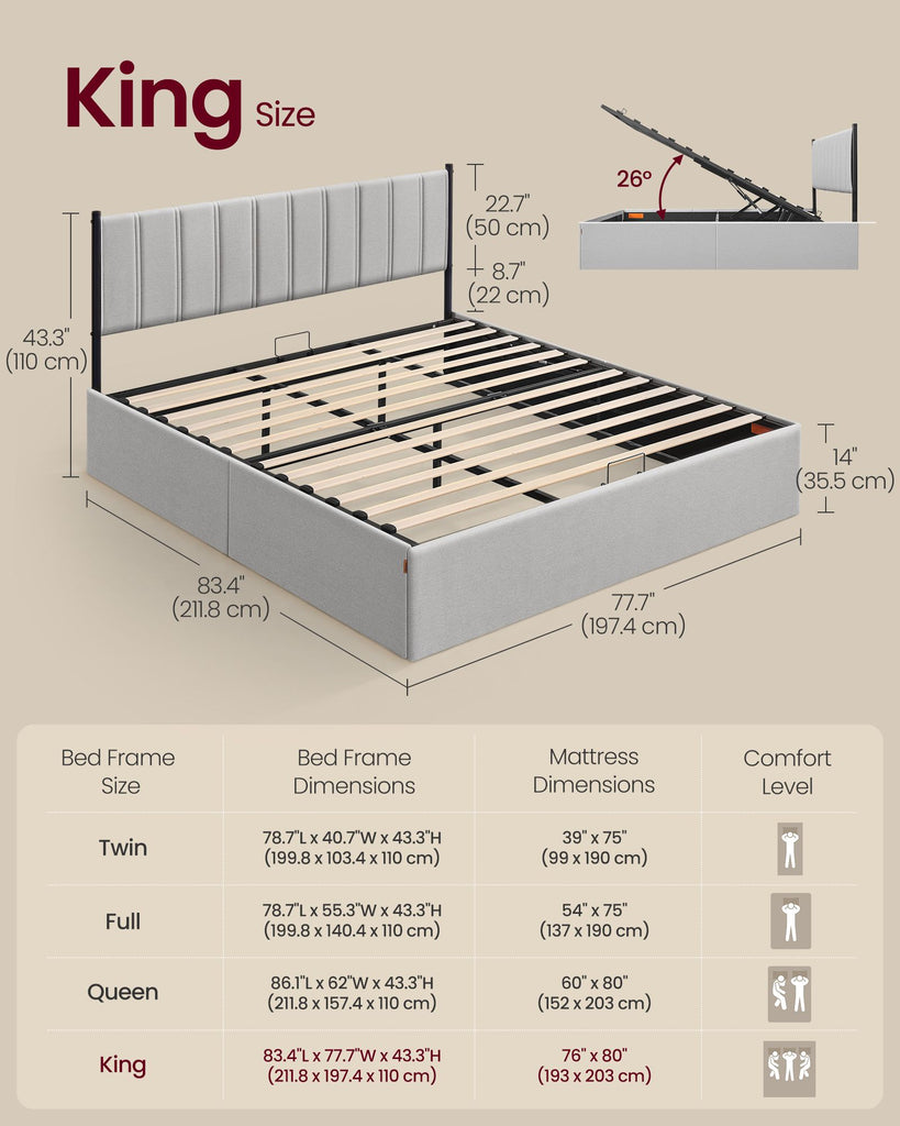 Specifications: Color: Dove Gray Material: Steel, Plywood, Particleboard, 24D High-Density Foam, Linen-Like Fabric Overall Product Size (with Headboard): 83.4"L x 77.7"W x 43.3"H (211.8 x 197.4 x 110 cm) Product Weight: 115 lb (52.2 kg) Suitable Mattress Thicknesses: 8"-12" (20.3-30.5 cm) Max. Static Lifting Capacity of the Hydraulic Lift: 176 lb (80 kg) Max. Static Weight Capacity of the Bed Frame: 1100 lb (500 kg) Package Contents: 1 x King Bed Frame 1 x Assembly Kit 1 x Instructions