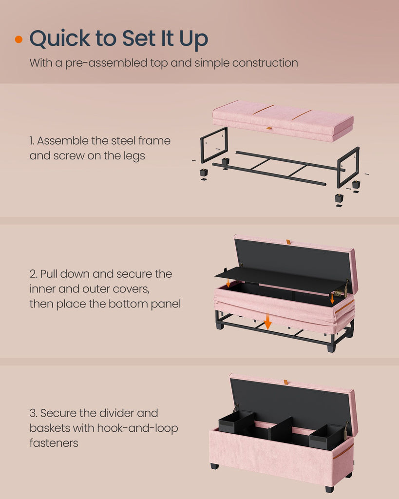 Stylish Design and Versatile Functionality Elevate your home with this stylish and versatile ottoman bench. Its elegant design seamlessly blends with any decor, offering both beauty and practicality. Perfect as a shoe bench, coffee table, or bed end bench, this piece effortlessly enhances any room with its charm and functionality. Practical Storage and Reliable Construction Whether you're storing essentials or adding extra seating, the ottoman's sturdy construction ensures lasting reliability. The spacious interior helps keep your space tidy, while the thoughtful safety features provide peace of mind. Transform your living space with this must-have addition, where elegance meets everyday convenience. Specifications: Color: Jelly Pink Material: Chenille, MDF (Medium Density Fiberboard), Steel, Foam Padding, Non-Woven Fabric Product Size: 15.7"D x 43.3"W x 15.7"H (40 x 110 x 40 cm) Product Weight: 26.2 lb (11.9 kg) Max. Static Load Capacity: 660 lb (300 kg) Volume: 27 Gal. (103 L) Package Contents: 1 x Storage Ottoman Bench HOME Notes: Please fully cover the bench with the lid before sitting on top. Do not put oversized items in the ottoman.