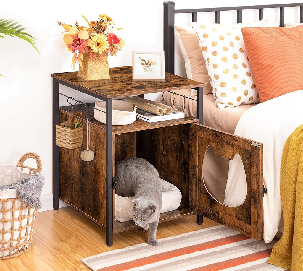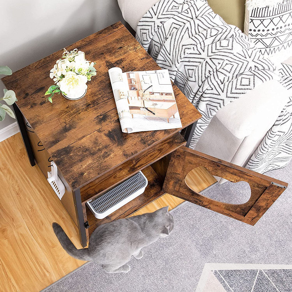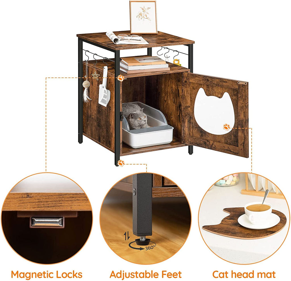 Unique Design: Want to give cats a perfect home? This stylish cat litter box enclosure cabinet is a good choice. The cute cat head entrance design is more attractive to cats in and out. With an artistic retro-colored panel and a solid metal frame, this work of art makes your family and friends have to admire.