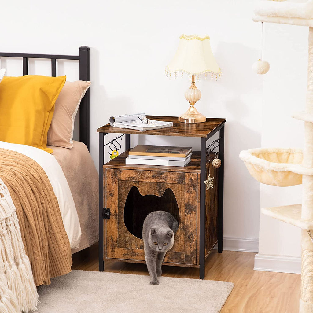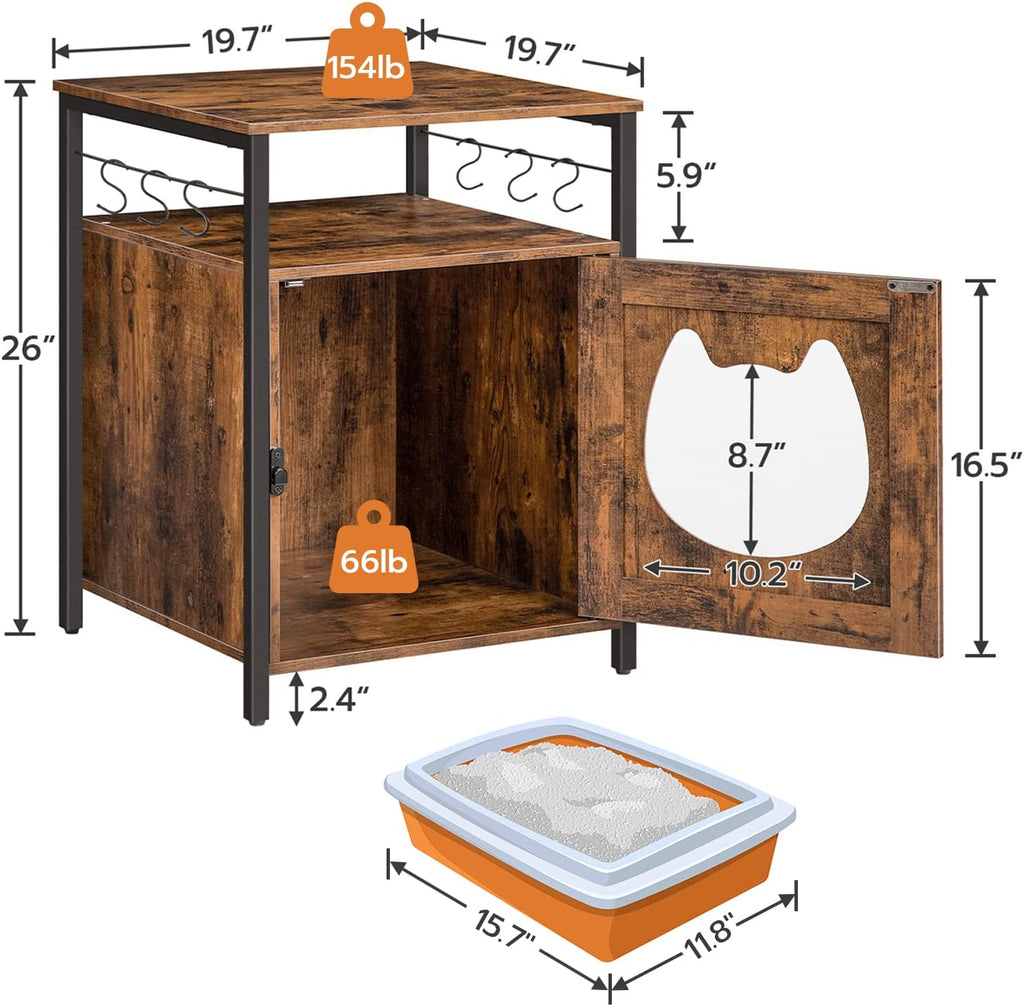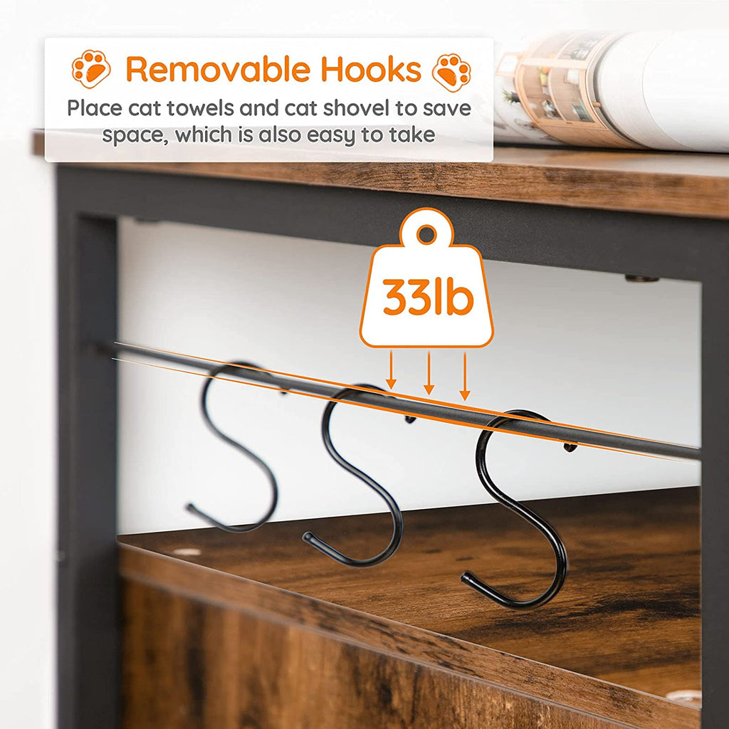 Multifunctional and Nice Accent: The wide space at the top can hold magazines, drinking glasses, potted plants. This stylish cat litter furniture as a bedside table, side table or coffee table in the living room to blend in with your other furnishings. There are a total of six movable hooks on the left and right of this hidden cat box, which can hang towels, cat litter shovel, and cat toys.