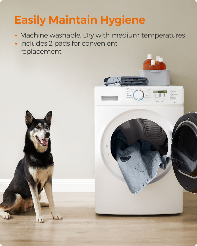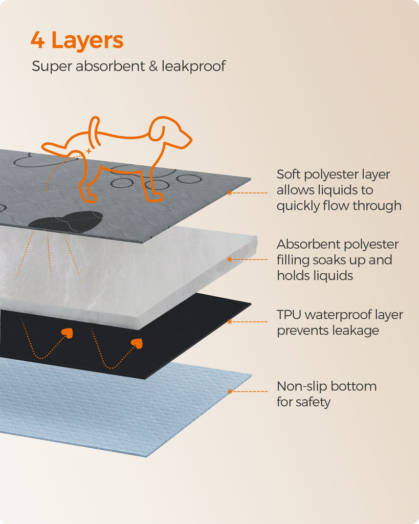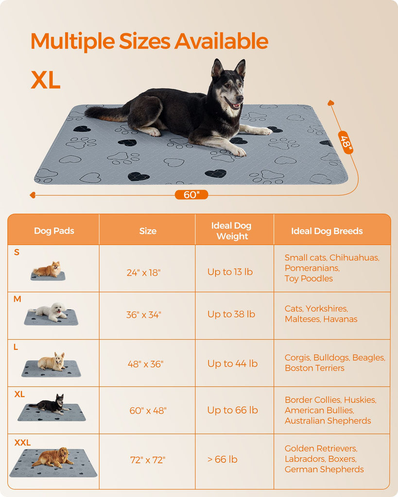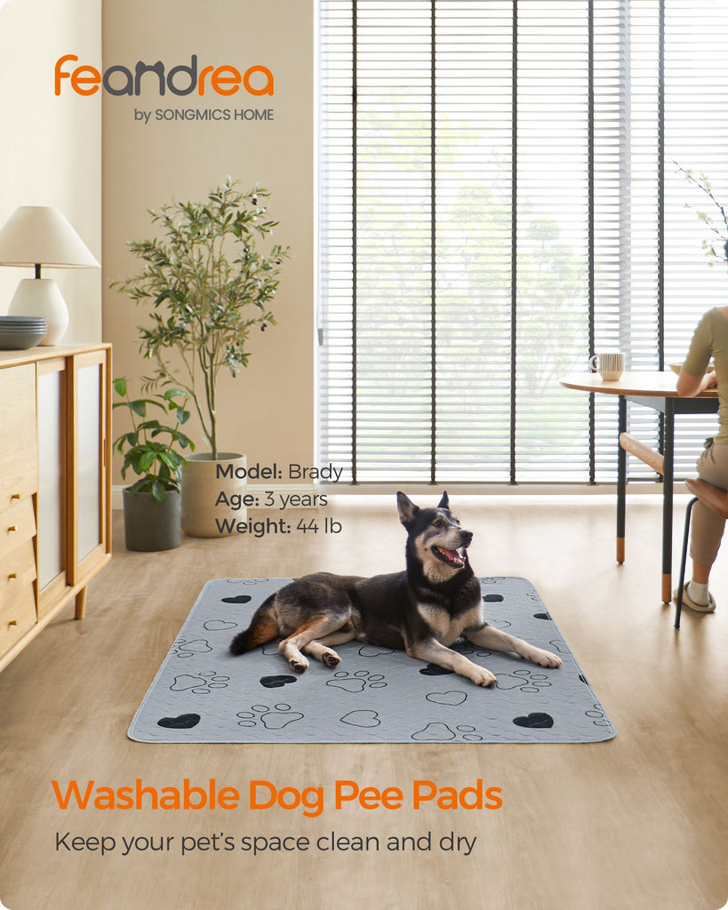 Specifications:Color: GrayMaterial:The First Layer: Polyester SurfaceThe Second Layer: Polyester FillingThe Third Layer: Waterproof TPU (Thermoplastic Polyurethane)The Bottom Layer: Polyester, Non-Slip DotsProduct Size: 48”L x 60”W (121.9 x 152.4 cm)Product Weight: 4 lb (1.8 kg)Package Contents:2 x Dog Pee PadFEANDREA Notes:The product is measured flat, it’s normal to have a 0.8-1.2" margin of error for the size.Due to light, there might be minor color differences for the products.Do not dry clean or use fabric softener or bleach.Use warm water for washing, tumble dry or air dry at medium temperature. The washing and drying temperature should not exceed 185 °F.