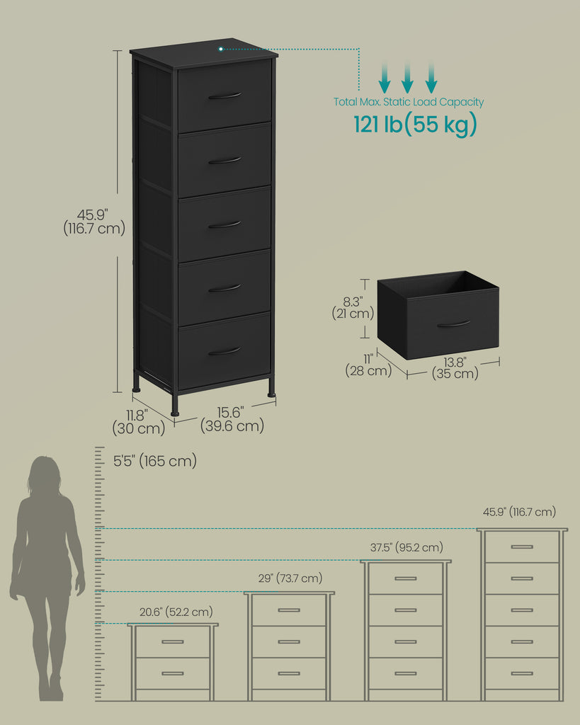 5 Drawer Dresser, Ink Black & Ebony Black, Steel Frame, 46" Tall Storage Organizer