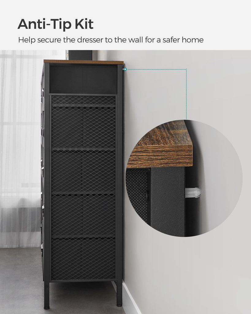 Color: Rustic Brown, Black Material: MDF (Medium Density Fiberboard), Steel, Non-Woven Fabric Product Size: 15.7D x 46.6W x 48.7H (40 x 118.5 x 123.7 cm) Product Weight: 60.6 lb (27.5 kg) Max. Static Load Capacity of the Top: 22 lb (10 kg) Max. Static Load Capacity of Each Drawer: 6.6 lb (3 kg) Overall Max. Static Load Capacity: 88 lb (40 kg) Package Contents: 1 x Chest of Drawers 1 x Accessory Bag 1 x Anti-Tip Kit 1 x Instructions
