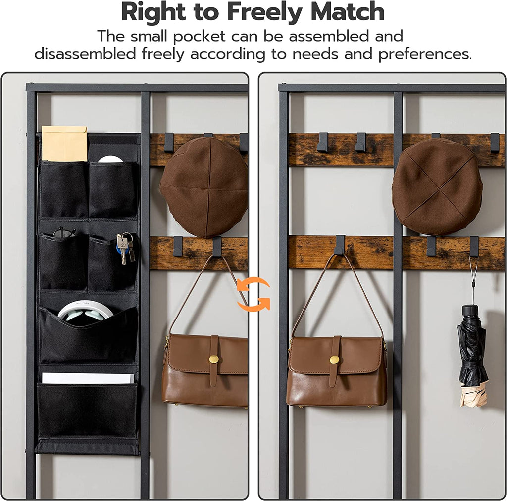 4-in-1 Design: Integrated 4-in-1 coat rack with shoe bench, 9 removable hooks, 6 storage pocket and 2-tier shoe storage shelves. Hang your coats, jackets, bags on coat hooks. The high with low mesh shoe storage rack is capable to hold sneakers and high boots. You family can also sit on the benches comfortably while putting on shoes.