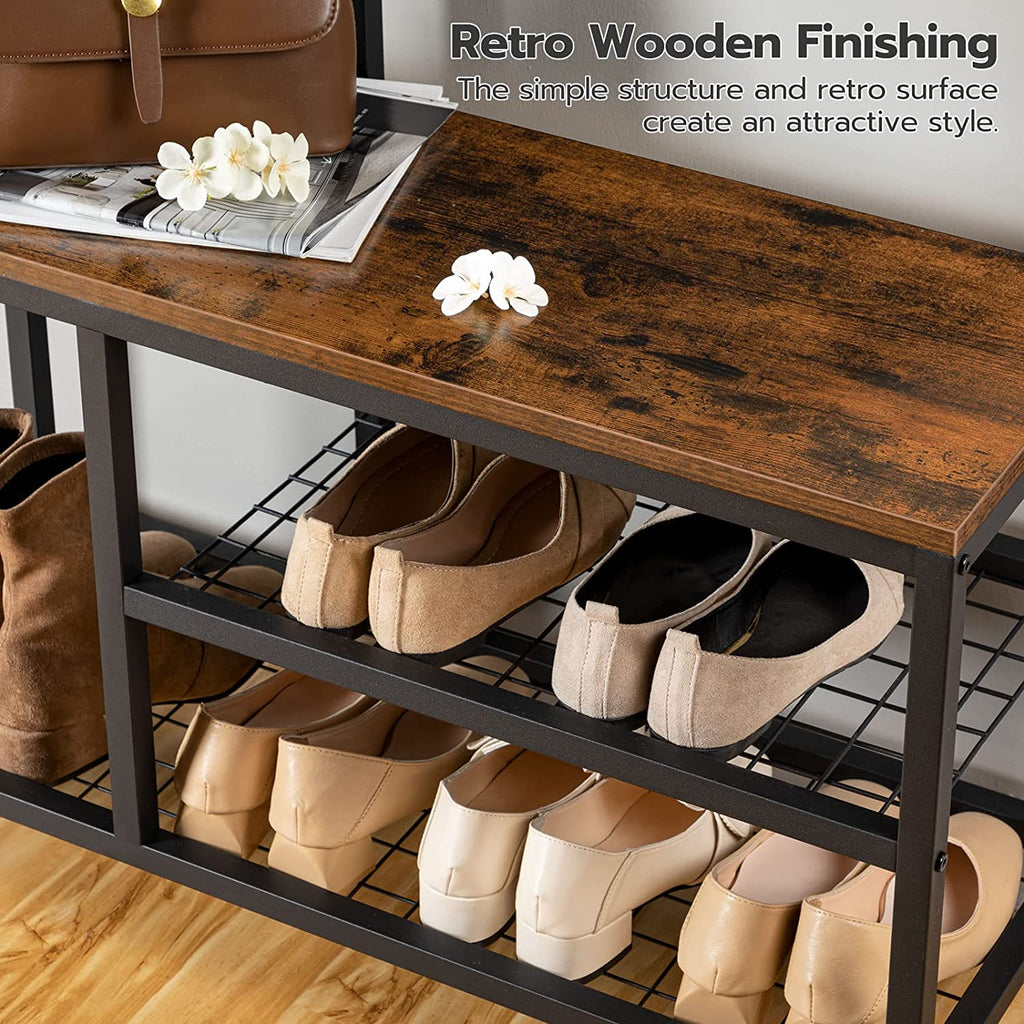 Retro Industrial Appearance: Rustic retro panels, black metal frame constructs this multifunctional coat rack shoe bench, to meet storage functions and artistic needs. The retro and minimalist design gives a sense of elegance, and it can be well matched with your home and office.