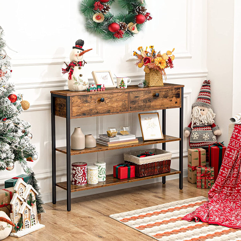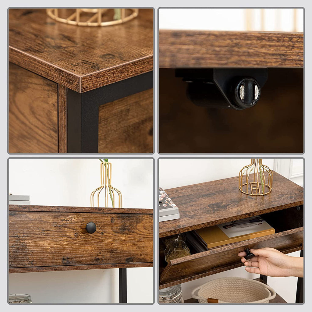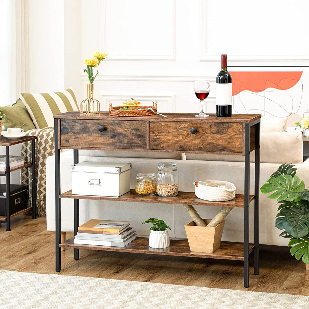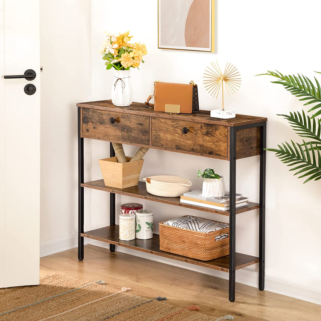Charming and Welcoming Foyer Table: Retro and fashionable rustic brown board brings a new fresh experience to your home. And the combination of drawer and laminate shelves makes the shelving unit substantial piece and brings a newly industrial front entryway for you.
