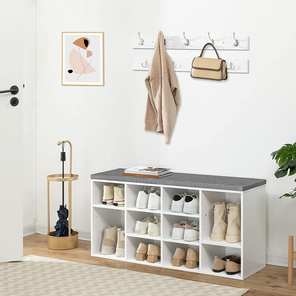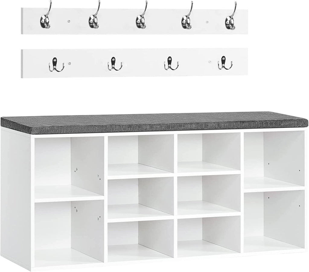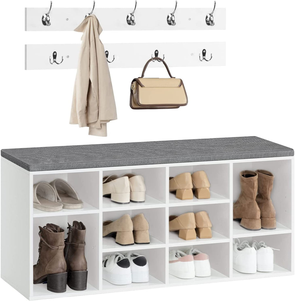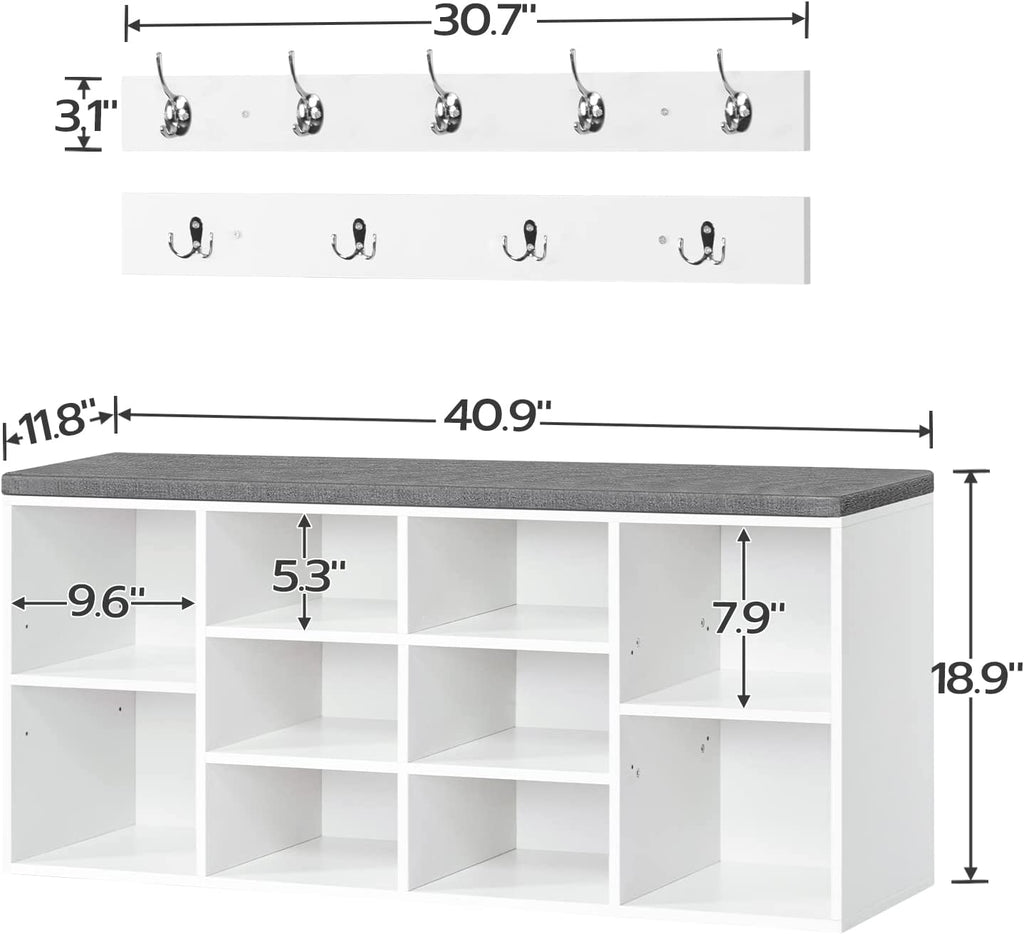 Clear at A glance: Size of the shoe rack is 40.9” L x 11.8” W x 18.9” H , and that of the coat rack is 30.7” L x 3.1” W, the coat rack is equipped with 9 hooks for up to 9 pieces of clothing. This storage bench with 10 compartments is able to store the daily shoes of your whole family. The hooks in 2 rows hold jackets and accessories. When you're in a hurry to get out, everything you need is within reach.