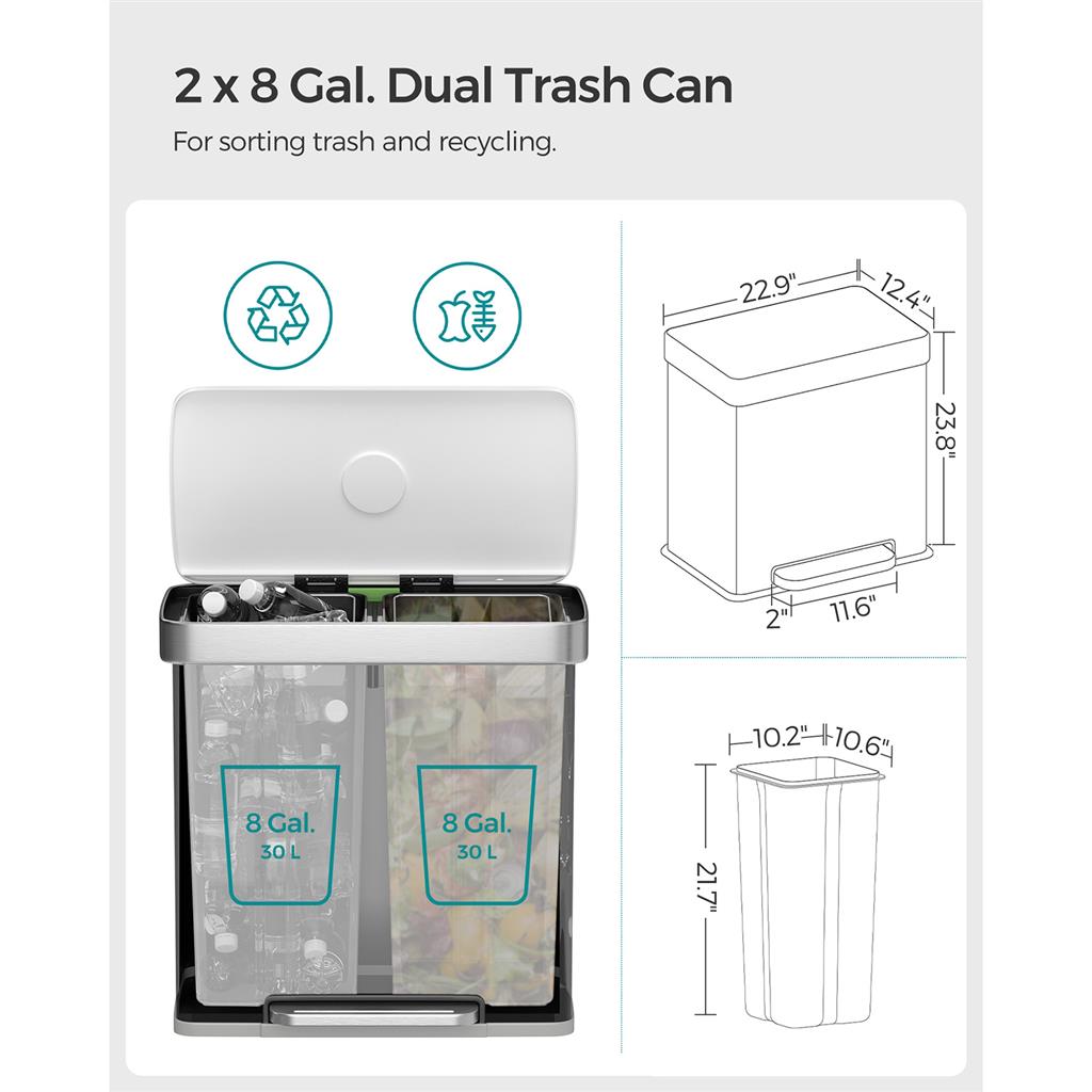 With two 8-gallon compartments, this dual trash can lets you sort all the trash in one spot without taking up too much space. Keep the lid open with the stay-open switch on the lid hinge when you are meal prepping. Step on the wide pedal to open the lid and the lid will close silently and softly after you step away. 2 removable plastic inner buckets with handles in this garbage can make emptying or cleaning much easier. The non-skid pads underneath the base ensure the can stays right where you place it and prevent scratches on the floor. The stainless steel body with a powder coating resists rust and fingerprints while the white finish fits perfectly in any kitchen.