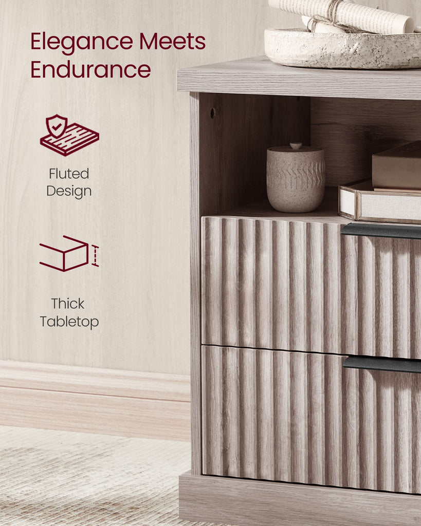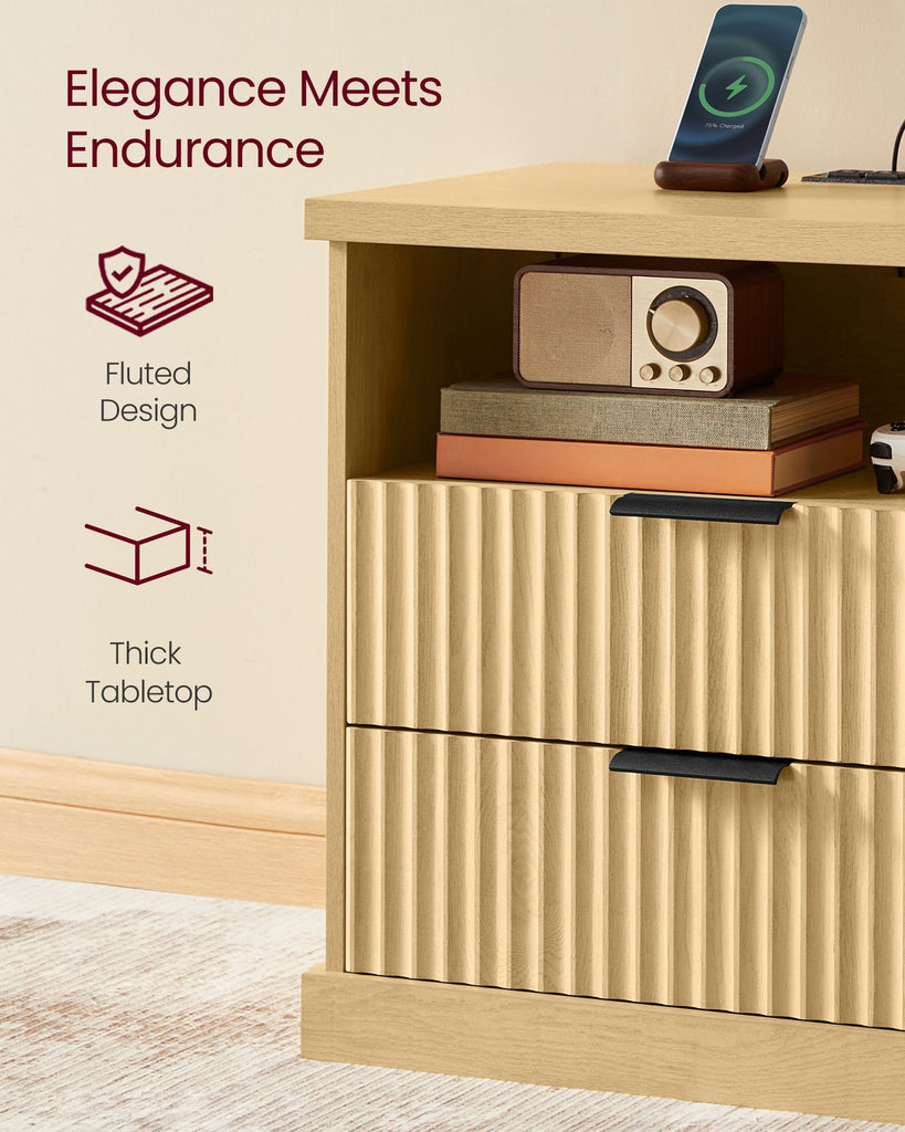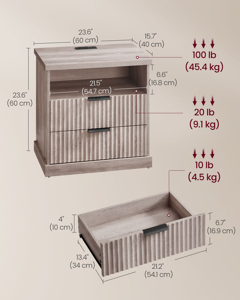 Specifications: Color: Oak Beige Material: Particleboard, MDF (Medium Density Fiberboard) Product Size: 15.7"D x 23.6"W x 23.6"H (40 x 60 x 60 cm) Product Weight: 39 lb (17.9 kg) Max. Static Load Capacity of the Top: 100 lb (45.4 kg) Max. Static Load Capacity per Drawer: 10 lb (4.5 kg) Max. Static Load Capacity of the Open Shelf: 20 lb (9.1 kg) Package Contents: 1 x Nightstand 1 x Accessory Kit 1 x Anti-Tip Kit 1 x Instructions