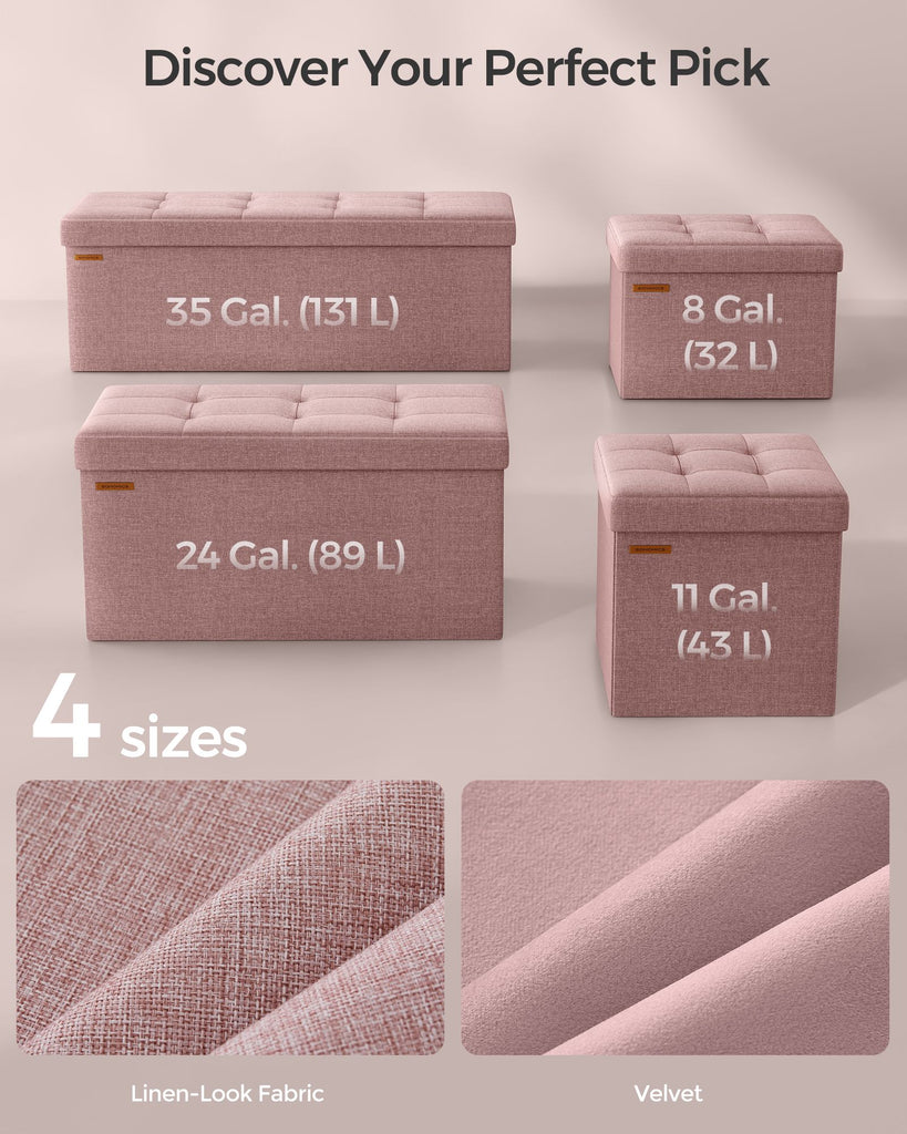 Color: Jelly Pink Material: MDF (Medium Density Fiberboard), Linen-Look Fabric, 25D High-Resilience Foam Product Size: 15"D x 30"W x 15"H (38 x 76 x 38 cm) Product Weight: 12.3 lb (5.6 kg) Max. Static Load Capacity: 660 lb (300 kg) Volume: 24 Gal. (89 L) Package Contents: 1 x Storage Ottoman