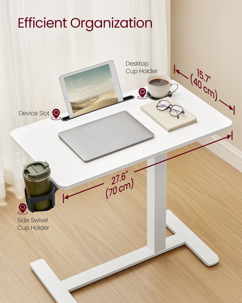 Overbed Table with Wheels, Mobile Standing Computer Desk, 27.6 x 15.7 Inches Tabletop, Adjustable Height, 2 Cup Holders, Phone and Tablet Slot, Cloud White