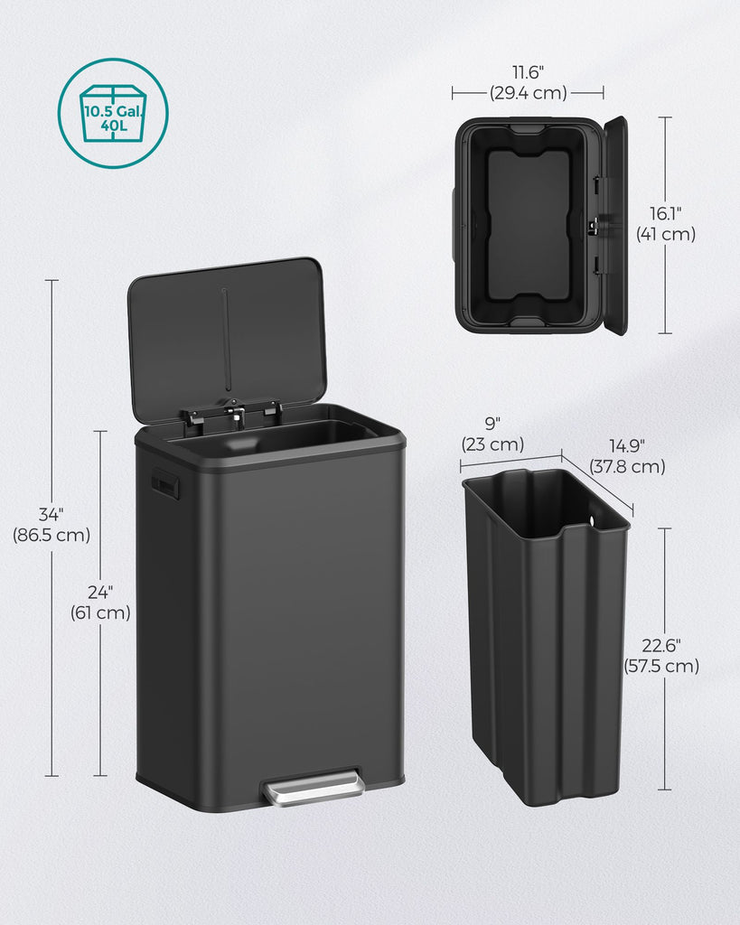 Inner Bucket Size: 14.9L x 9W x 22.6H (37.8 x 23 x 57.5 cm)
