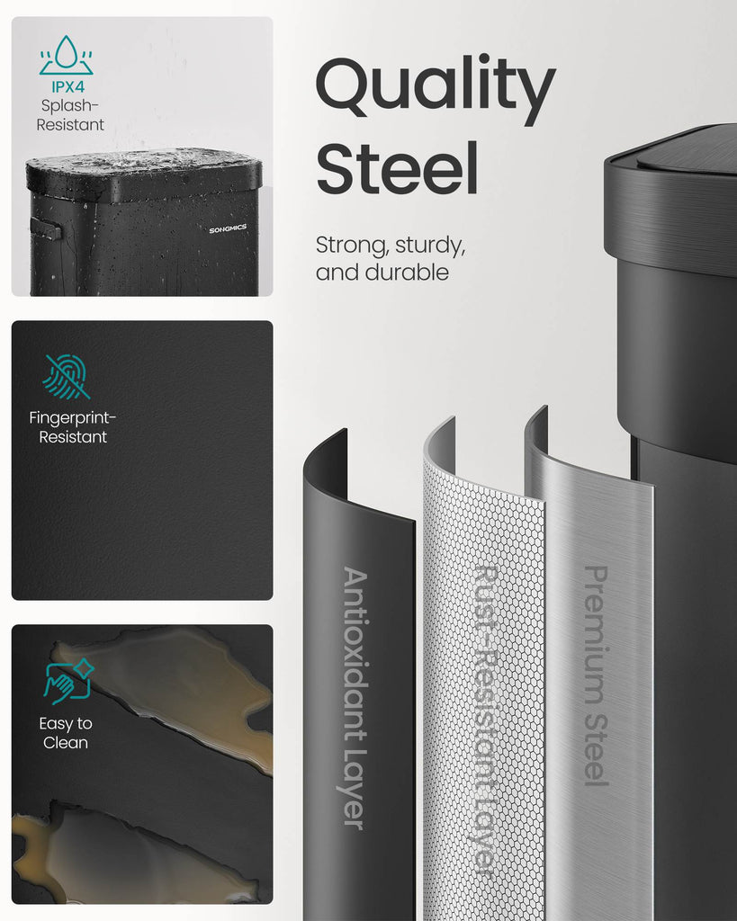 13-Gallon Motion Sensor Trash Can, Soft Close, Dual Open, Stainless Steel, Ink Black