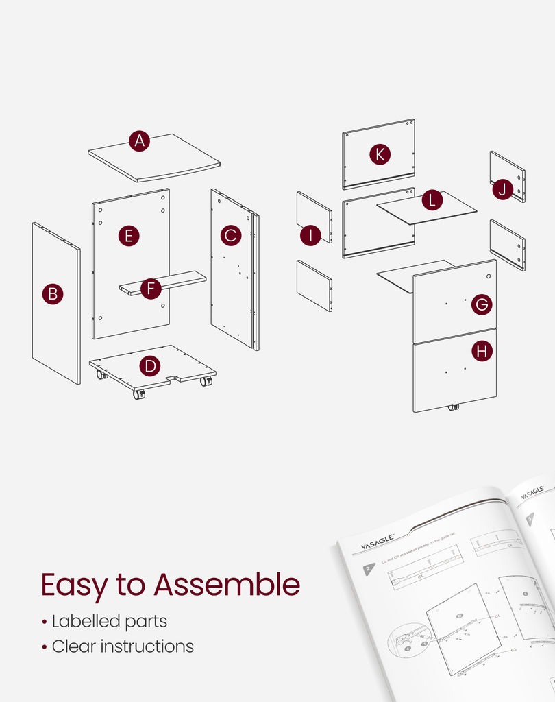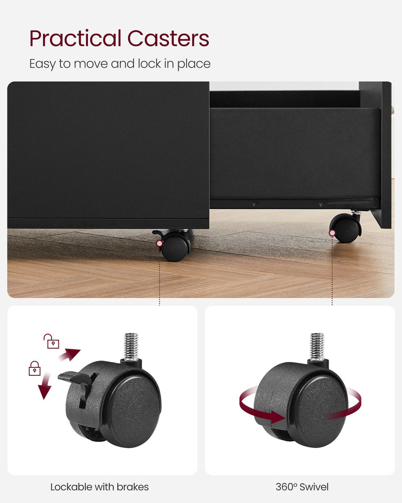 Specifications: Color: Ink Black Material: Particleboard, Metal Handle Product Size: 16.9"D x 17.5"W x 28.3"H (43 x 44.5 x 72 cm) Product Weight: 46.9 lb (21.3 kg) Total Max. Static Load Capacity: 110 lb (50 kg) Package Contents: 1 x File Cabinet 1 x Assembly Kit 1 x Instructions