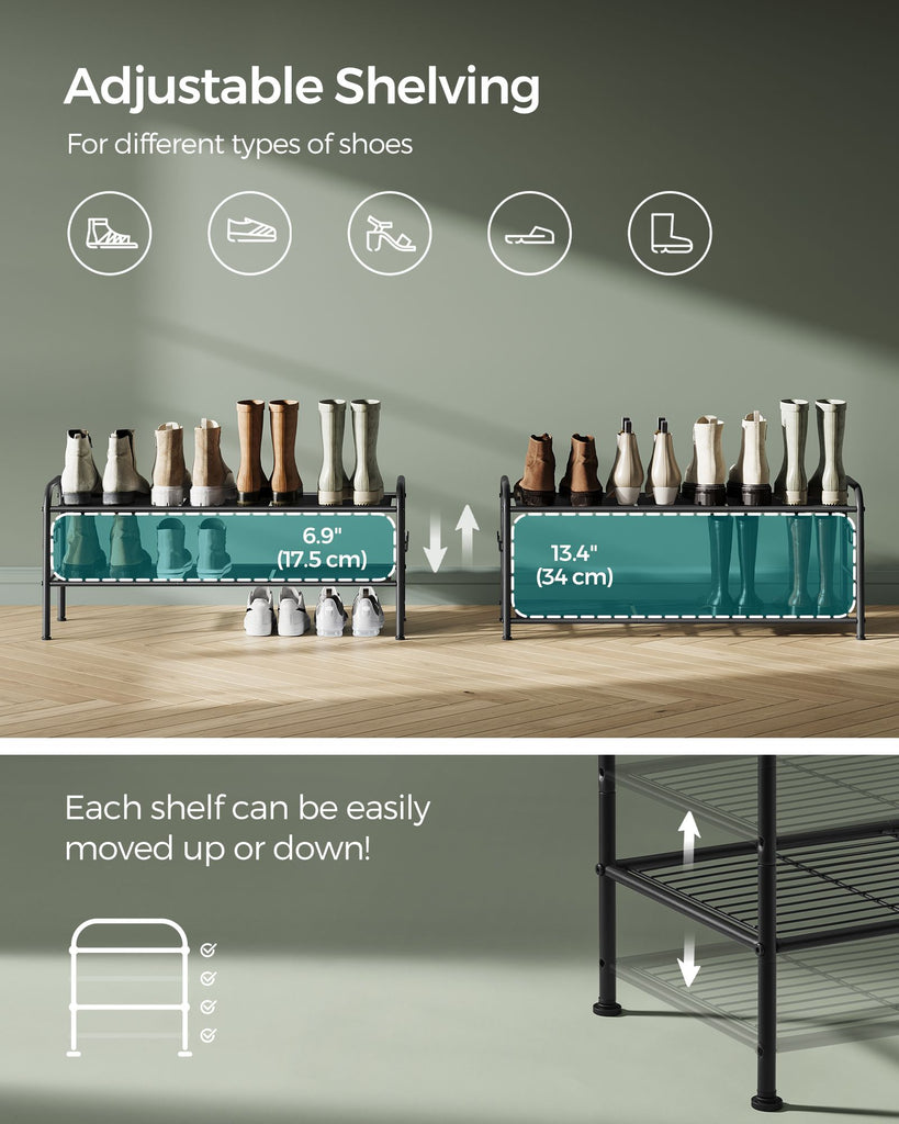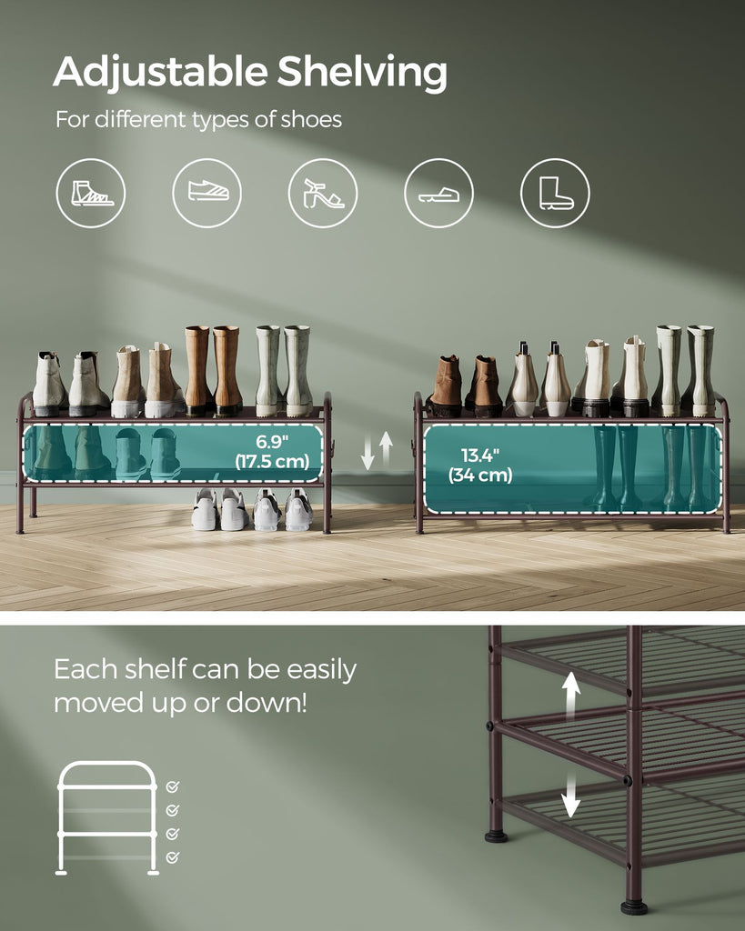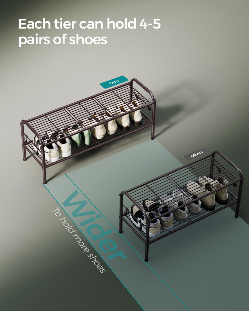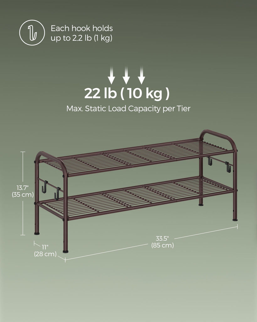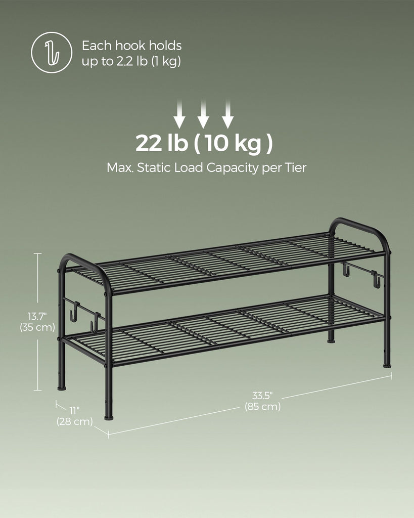 2-Tier Shoe Rack with 4 Side Hooks, Holds 10 Pairs of Shoes