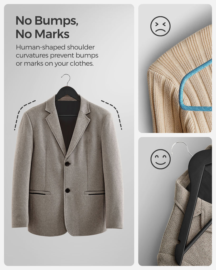Specifications: Color: Black Material: Solid Wood, Rubber Coating, Chrome-Plated Metal Hook Size of Each Hanger: 17.5L x 0.5W x 9.1H (44.5 x 1.2 x 23 cm) Total Weight of 20 Hangers: 5.5 lb (2.5 kg) Max. Load Capacity of Each Hanger: 11 lb (5 kg)
