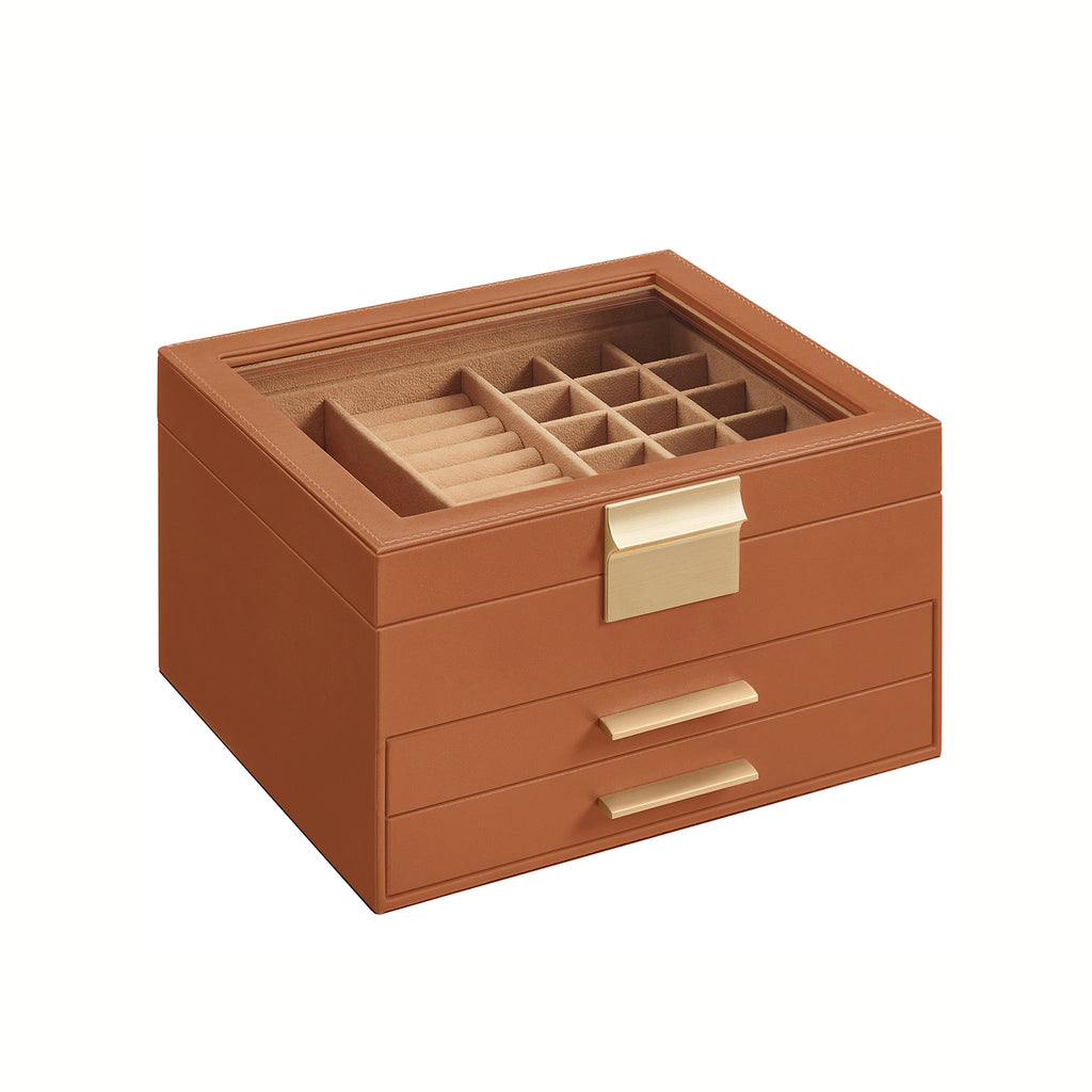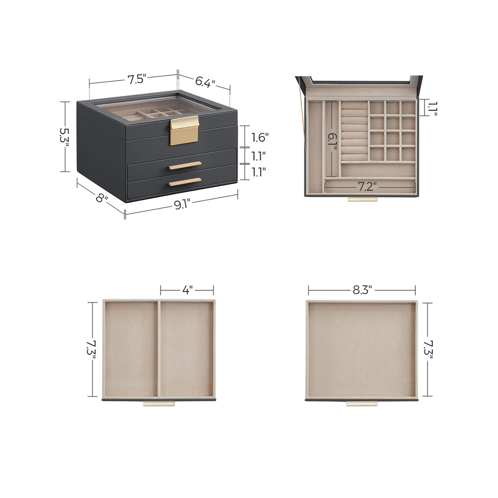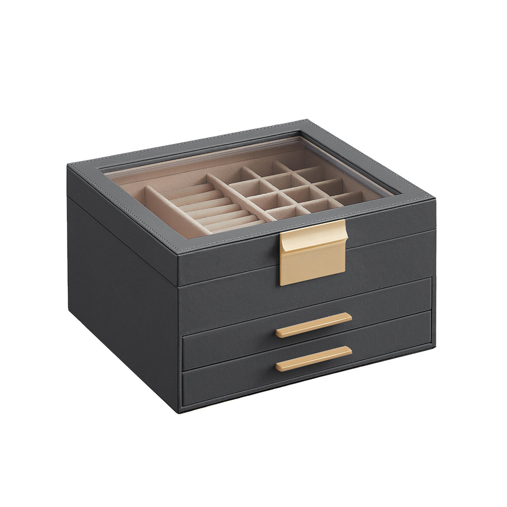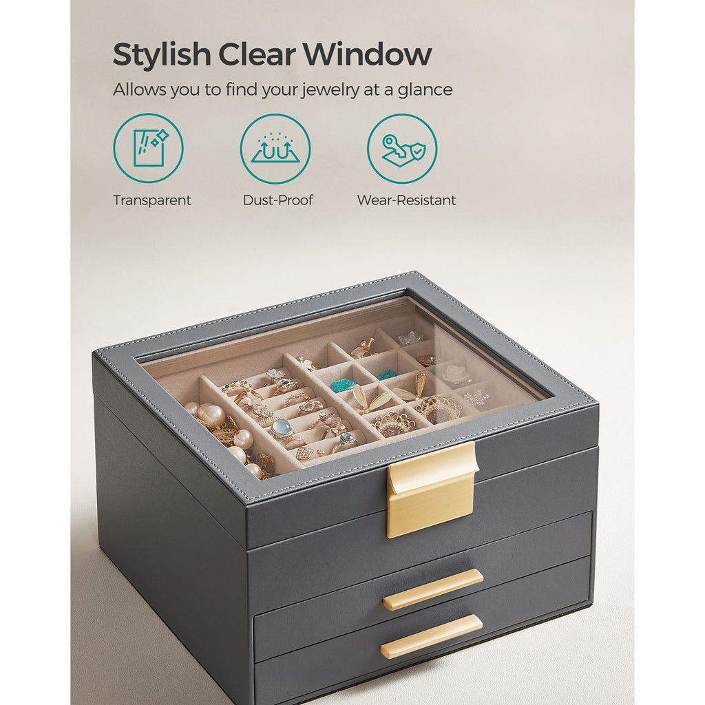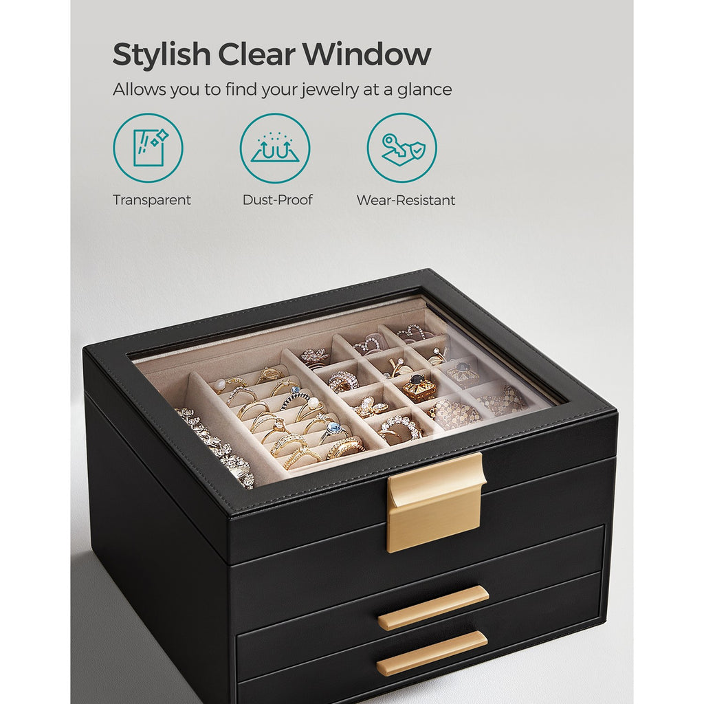 3-Layer Jewelry Box with Glass Lid, 2 Drawers