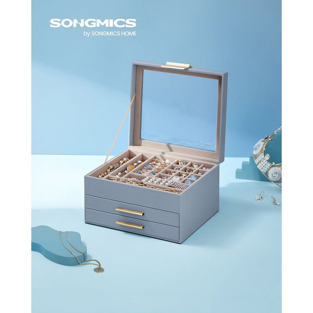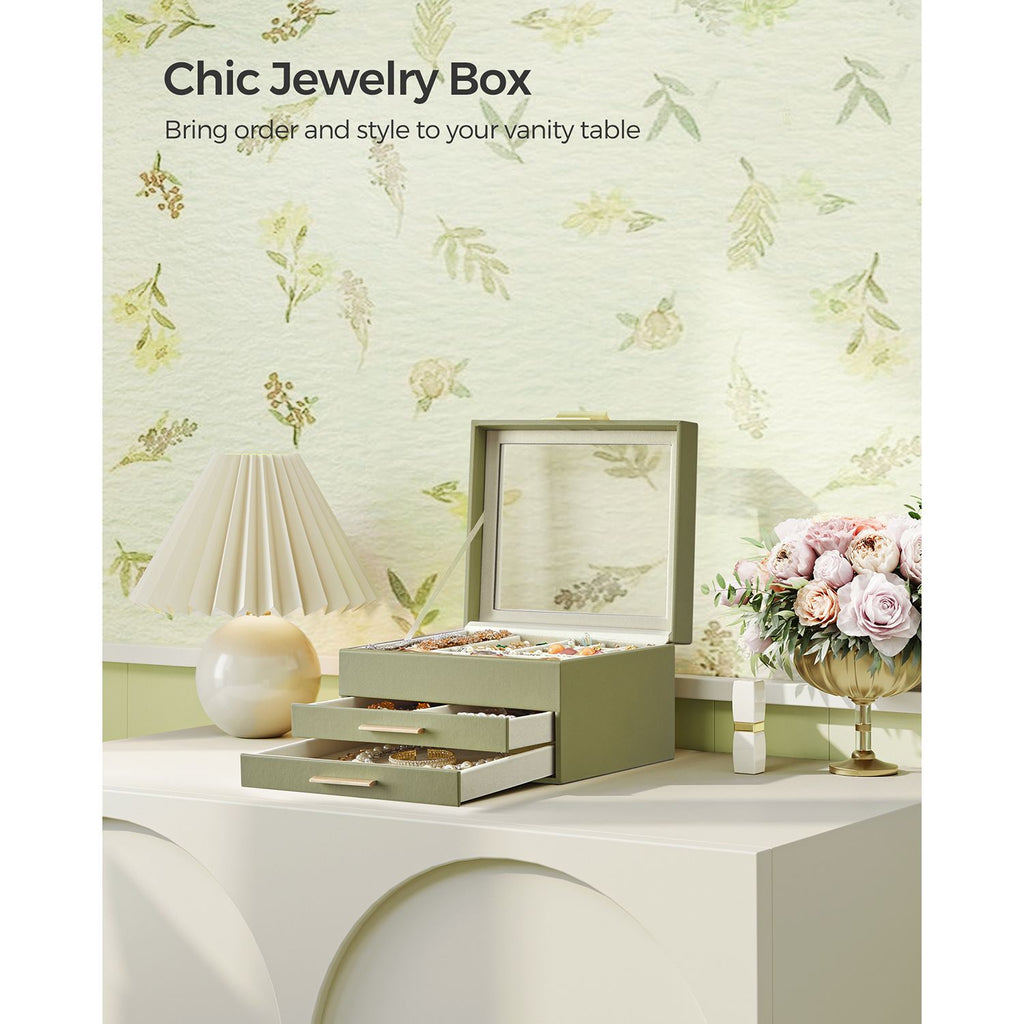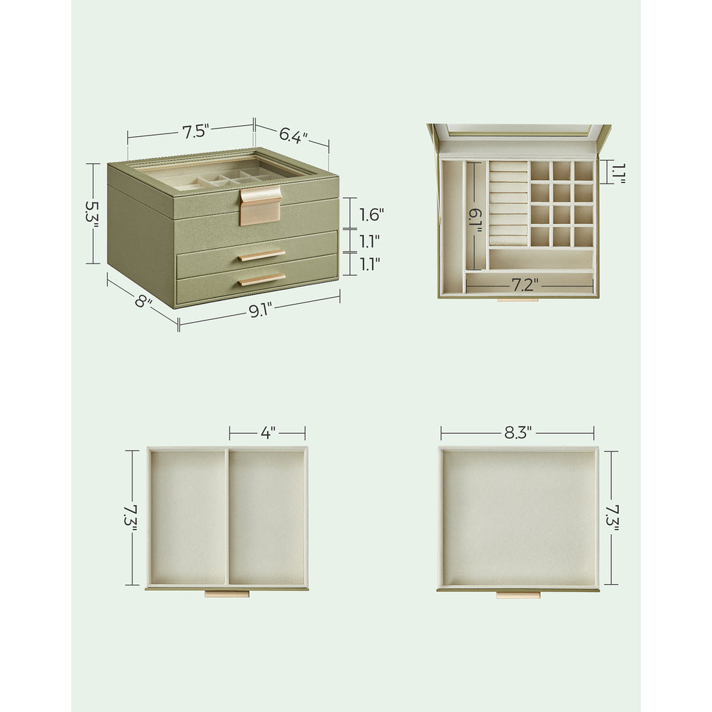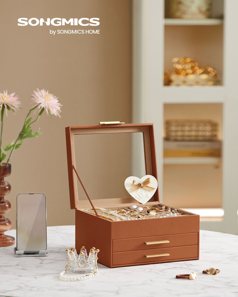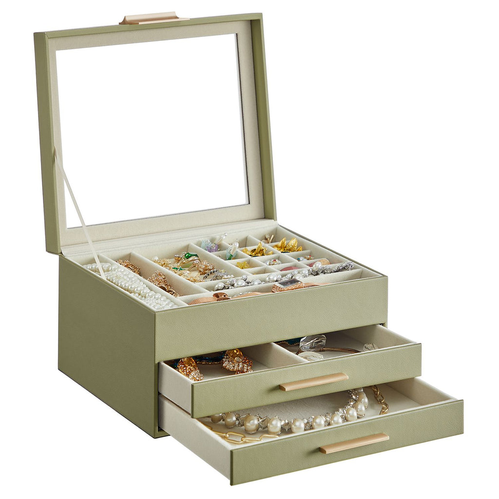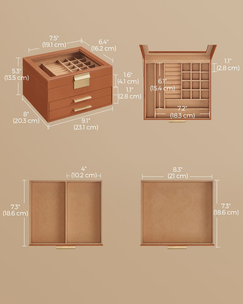 3-Layer Jewelry Box with Glass Lid, 2 Drawers