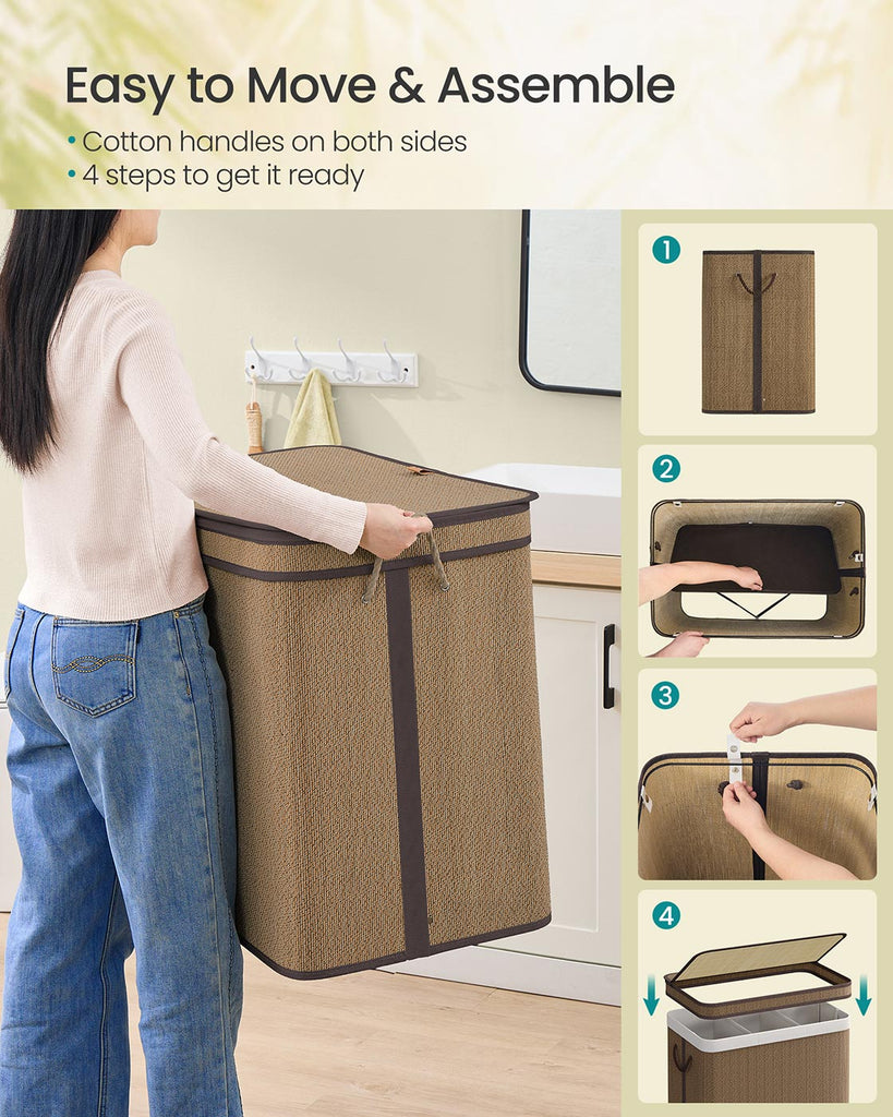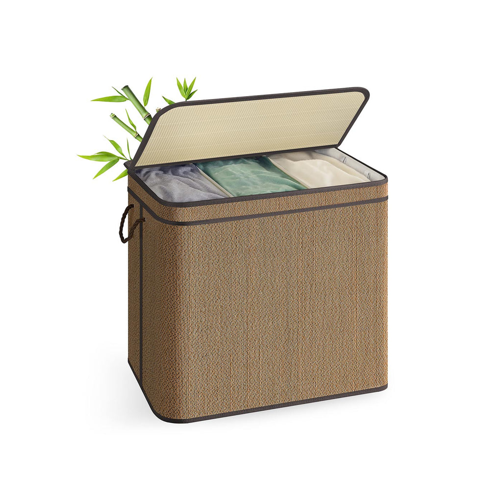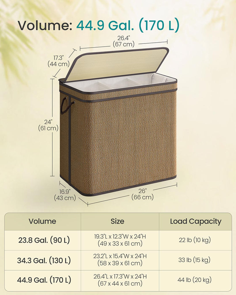 Tired of messy laundry days? The Laundry Hamper transforms chaos into order, making laundry day a breeze. Key Features of This Laundry Hamper: Large Capacity: Holds up to 44.9 gallons of laundry, keeping all your clothes in one place. With Lid: Protects your laundry from dust and ensures privacy. Easy to Transport and Store: Features side handles and a foldable design for convenience. Durable and Stable: Made from quality bamboo and a sturdy steel frame, supporting up to 44 lb. Simple Assembly: Easily assembled by one person. Specifications: Color: Brown Material: Bamboo, Polyester-Cotton Blend Fabric, Steel, Nylon, PU Leather, MDF (Medium-Density Fiberboard), Plastic, Cotton Product Size: 26.4"L x 17.3"W x 24"H (67 x 44 x 61 cm) Product Weight: 7.9 lb (3.6 kg) Max. Static Load Capacity: 44 lb (20 kg) Package Contents: 1 x Laundry Hamper with 3 Sections 1 x Accessory Kit 1 x Instructions Notes: Avoid storing sharp objects in this laundry hamper to prevent damage or injury. The laundry basket has a weight capacity of 44 lb. Please do not exceed this limit. It is advisable not to place items on the lid. Keep the laundry hamper dry and away from humid environments.