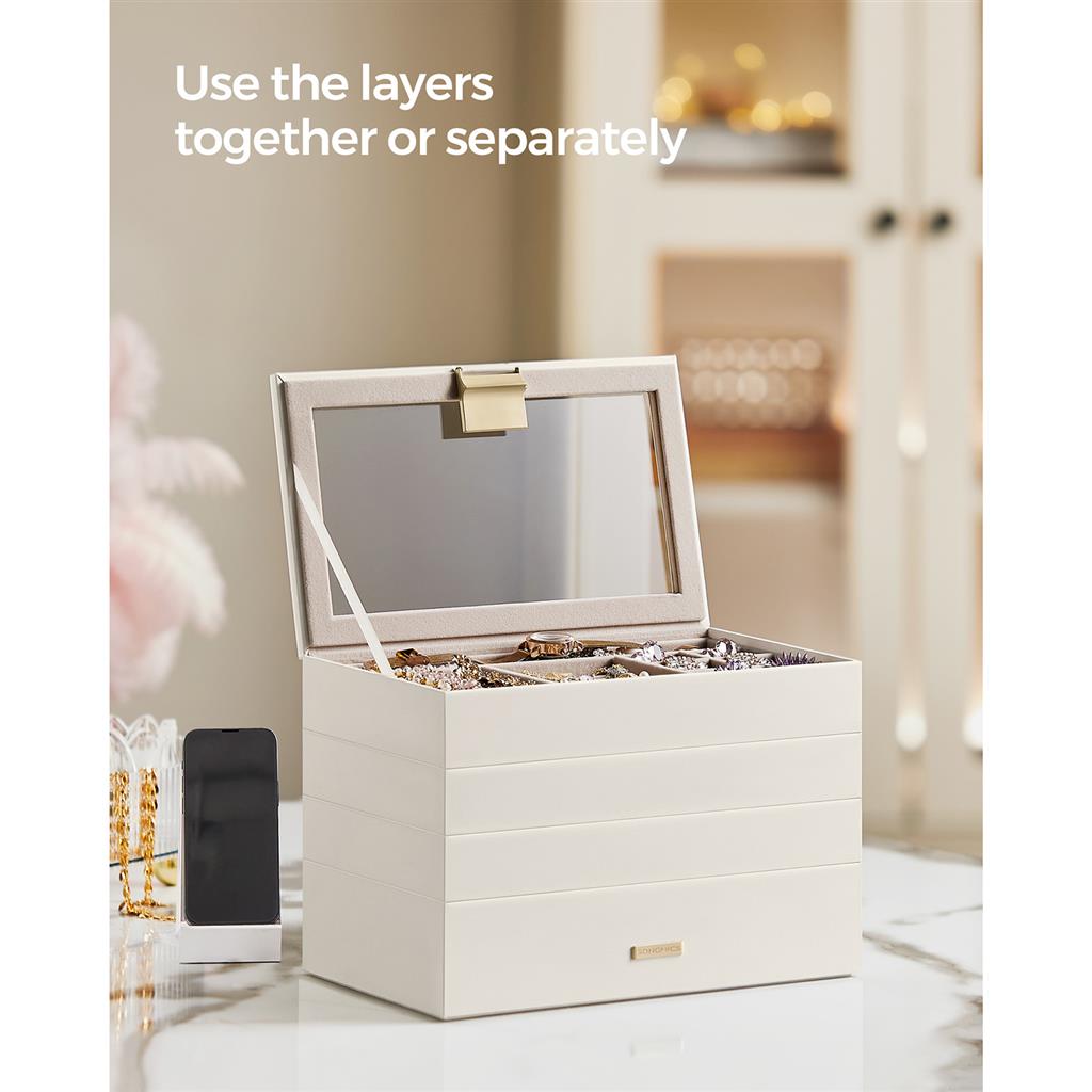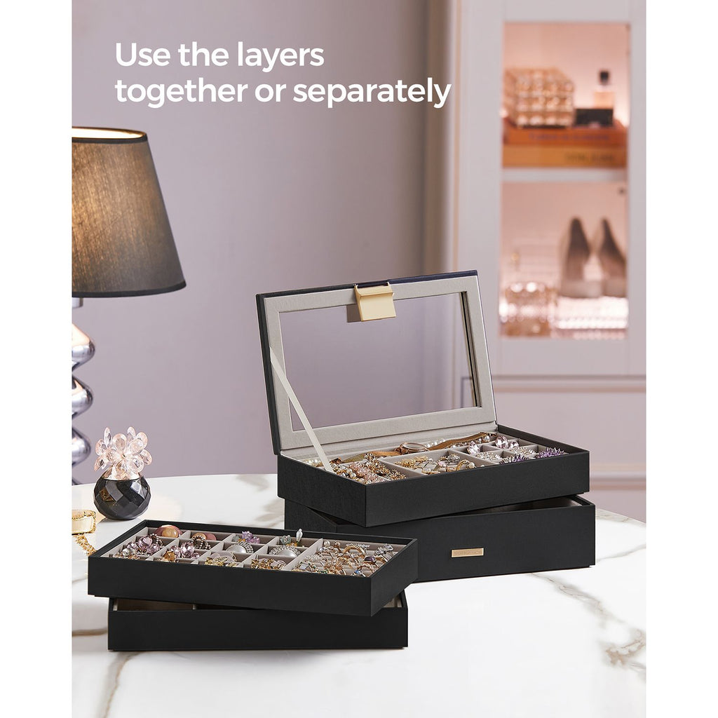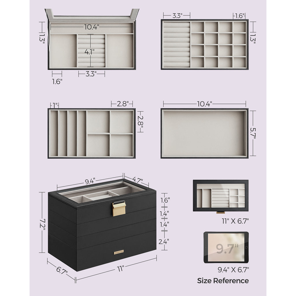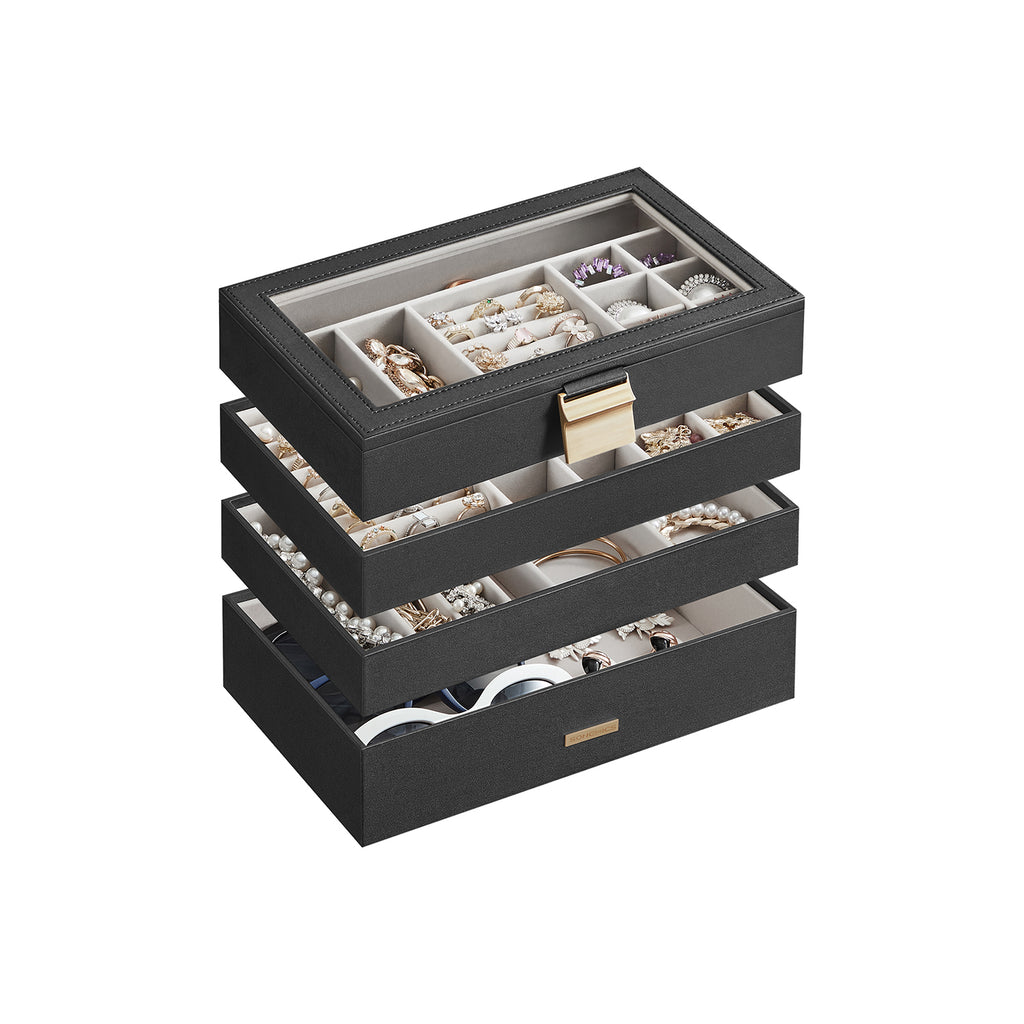 With elegant jewelry boxes, all of your cherished accessories will be well preserved. Every time you open our jewelry case you'll see your accessories glitter, untarnished by dust or scratches. Our jewelry boxes are the perfect gift for you or your loved ones for any celebration. Experience the joy of opening your perfectly preserved and beautifully displayed jewelry every day with a jewelry case a small but significant way to remind yourself that you deserve the best. Highlights of This Jewelry Organizer at a Glance: 4 Spacious Jewelry Trays: Organize your accessories how you want to. Adjustable Layers: Combine and remove them however you want. You can even turn them into drawers for your dressing table. Stable Design: Gooves on the bottom of each layer to allow stacking and prevent wobbling. Transparent Lid: Dustproof, and a great way to view your jewelry at a glance. Removable Dividers: For you to organize accessories of different sizes.