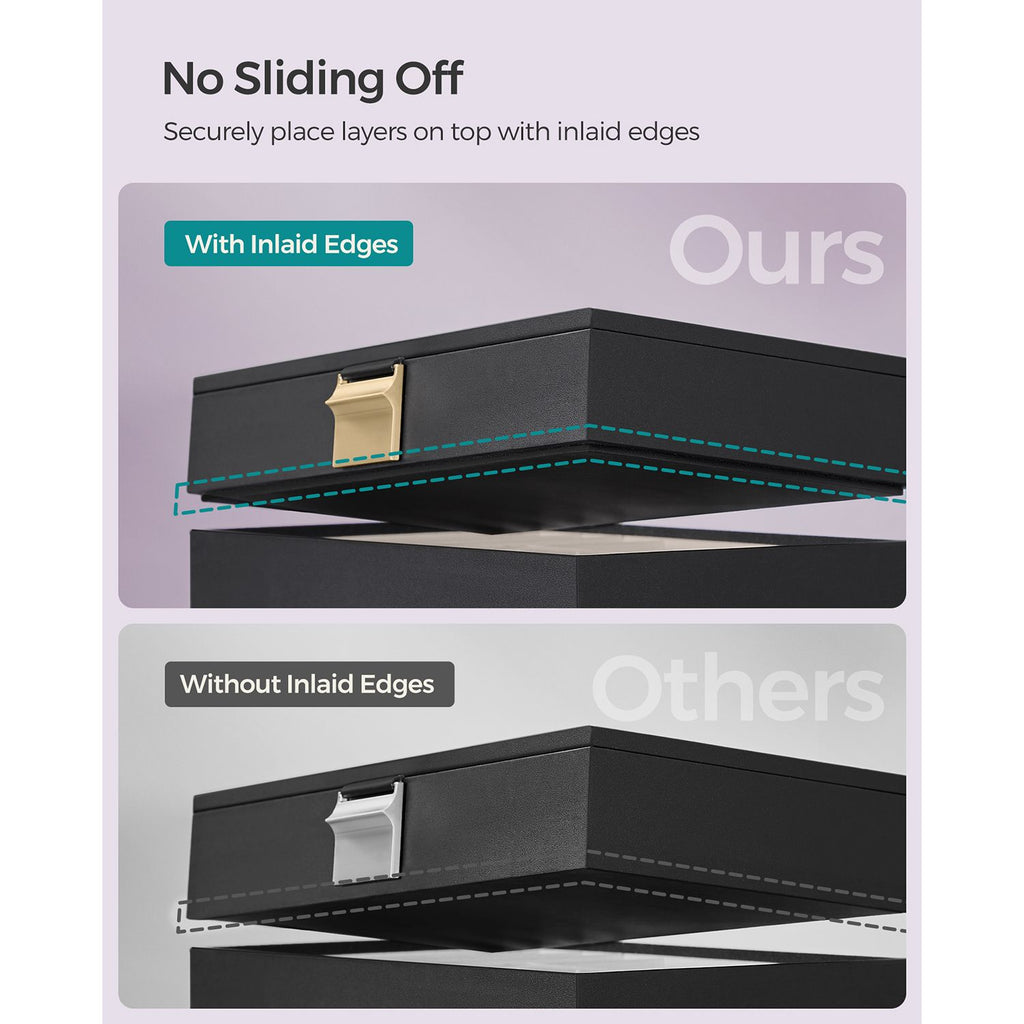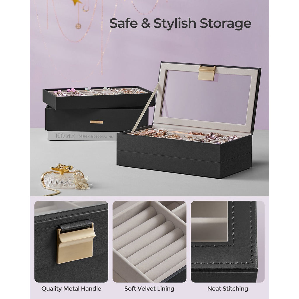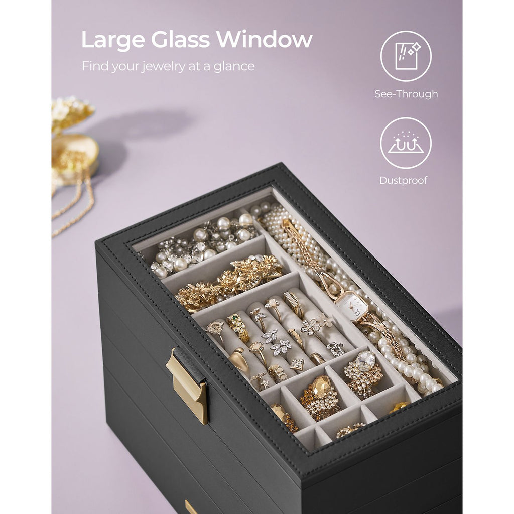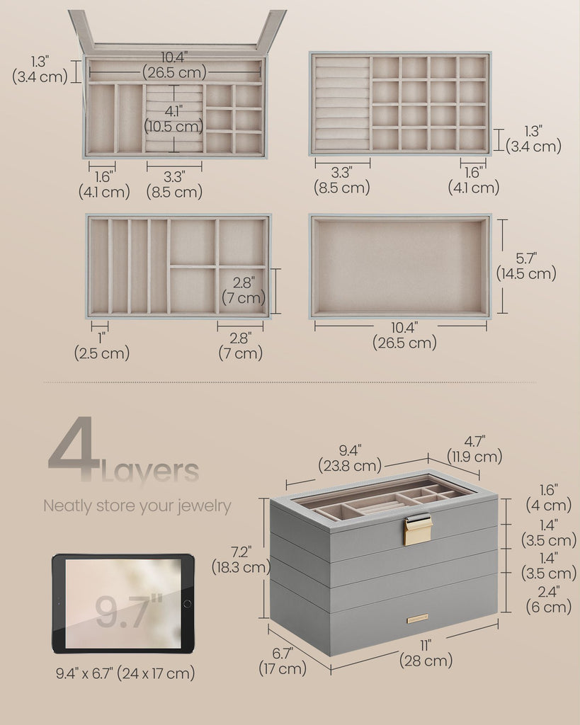 With elegant jewelry boxes, all of your cherished accessories will be well preserved. Every time you open our jewelry case you'll see your accessories glitter, untarnished by dust or scratches. Our jewelry boxes are the perfect gift for you or your loved ones for any celebration. Experience the joy of opening your perfectly preserved and beautifully displayed jewelry every day with a jewelry case a small but significant way to remind yourself that you deserve the best. Highlights of This Jewelry Organizer at a Glance: 4 Spacious Jewelry Trays: Organize your accessories how you want to. Adjustable Layers: Combine and remove them however you want. You can even turn them into drawers for your dressing table. Stable Design: Gooves on the bottom of each layer to allow stacking and prevent wobbling. Transparent Lid: Dustproof, and a great way to view your jewelry at a glance. Removable Dividers: For you to organize accessories of different sizes.