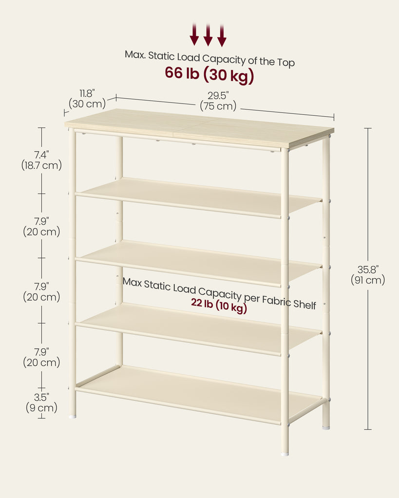 Max. Static Load Capacity per Fabric Shelf: 22 lb (10 kg)