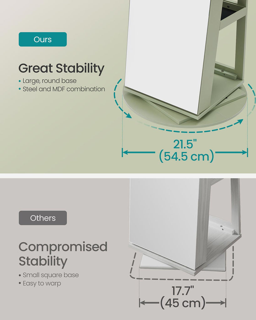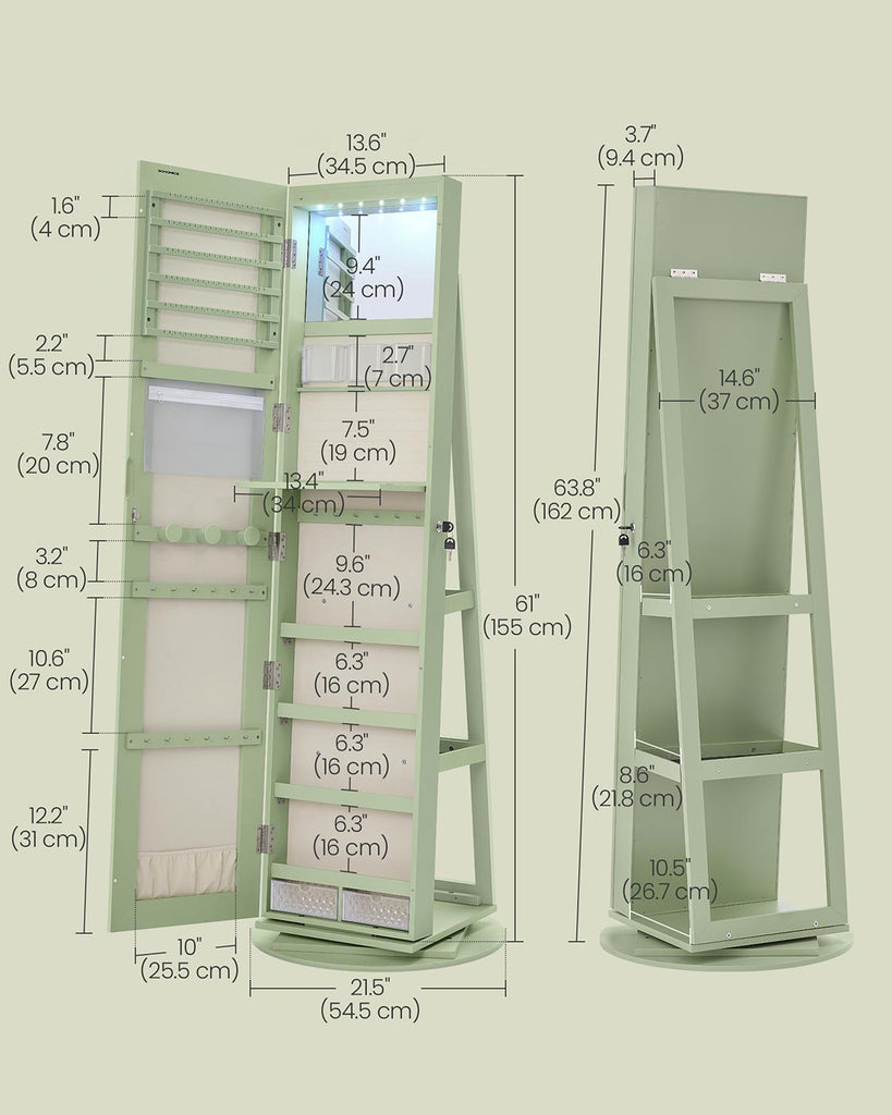 Specifications: Color: Laurel Green Surface, Cream White Lining Material: MDF (Medium Density Fiberboard), Steel, Velvet, Glass Overall Product Size: 21.5"D x 21.5"W x 63.8"H (54.5 x 54.5 x 162 cm) Cabinet Size: 3.7"D x 14.6"W x 61"H (9.4 x 37 x 155 cm) Inner Mirror Size: 13.6"W x 9.4"H (34.5 x 24 cm) Product Weight: 50.2 lb (22.8 kg) Package Contents: 1 x Jewelry Cabinet 2 x Key 1 x Accessory Kit 1 x Instructions