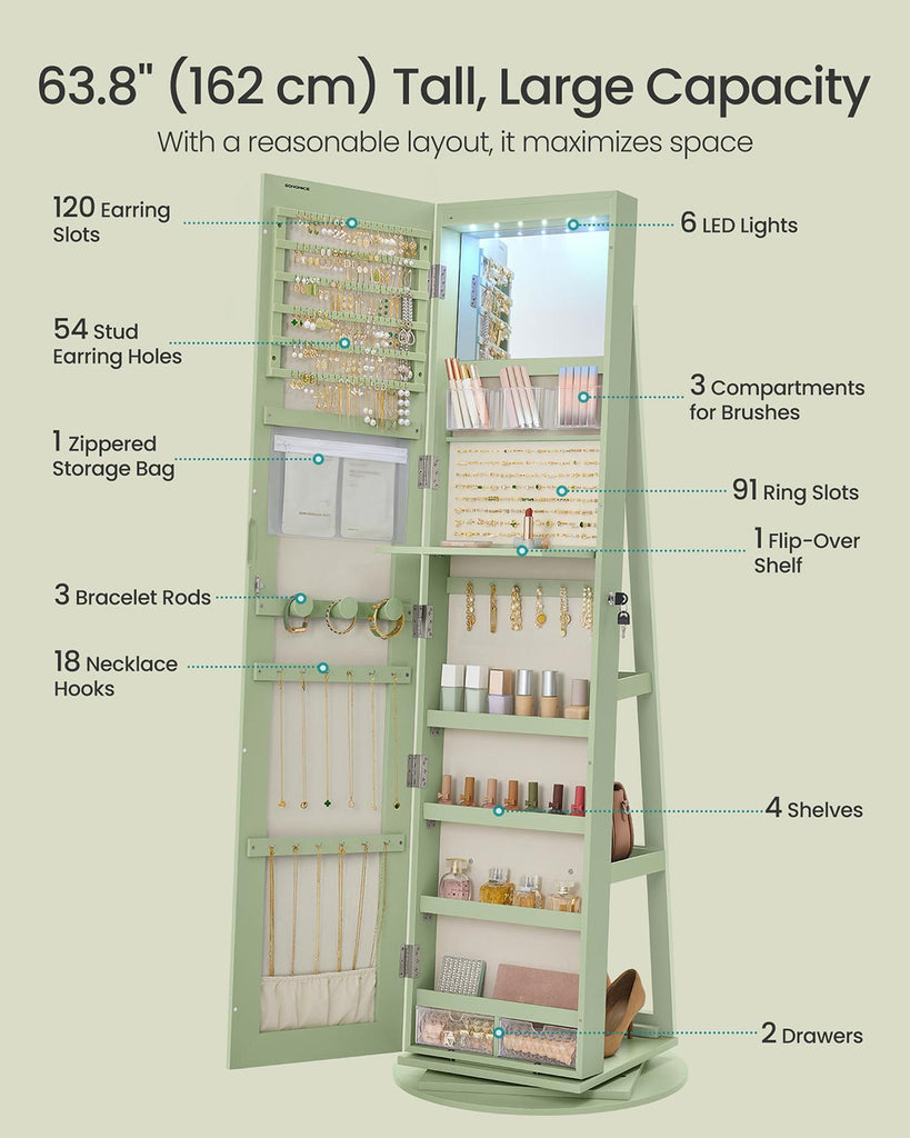 6 LEDs Lockable Mirror Jewelry Cabinet Laurel Green Surface Cream White Lining