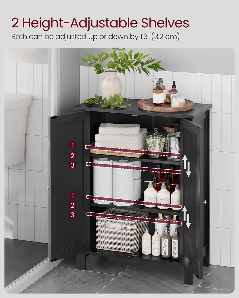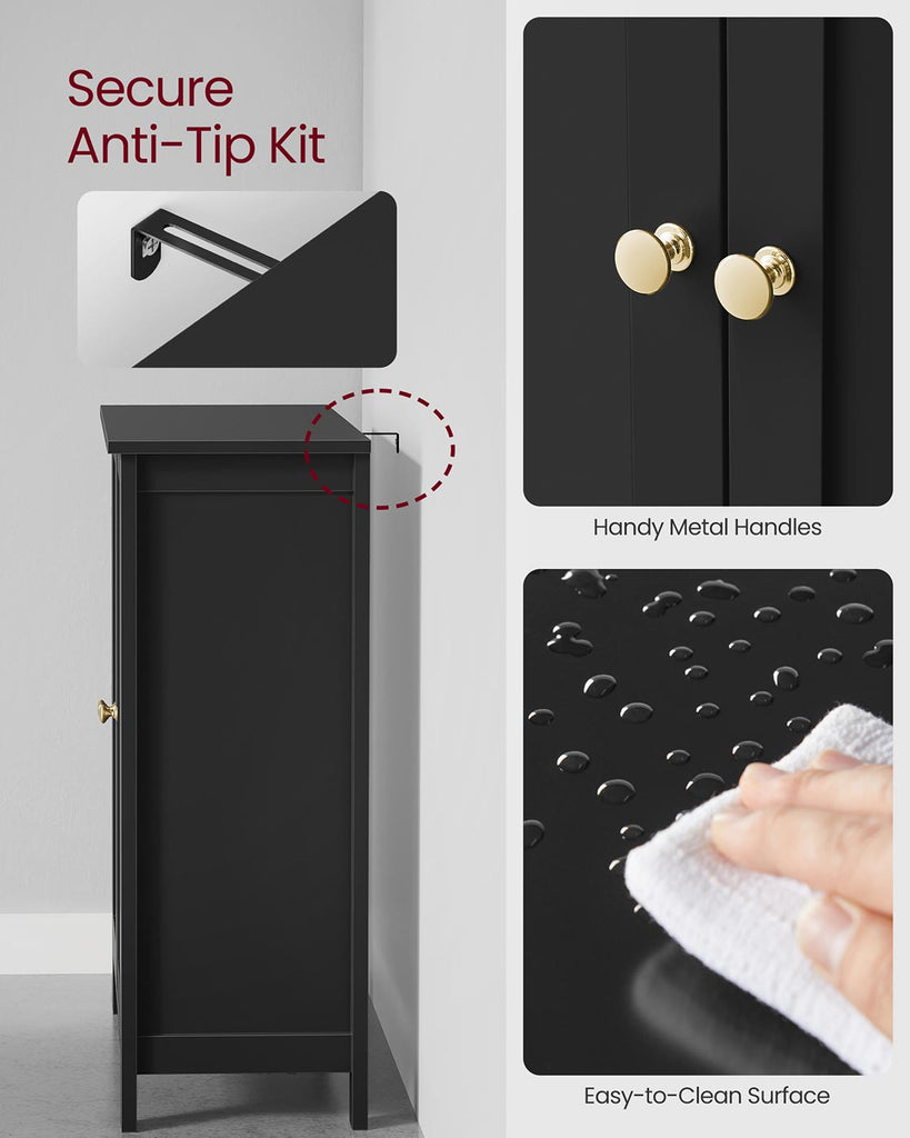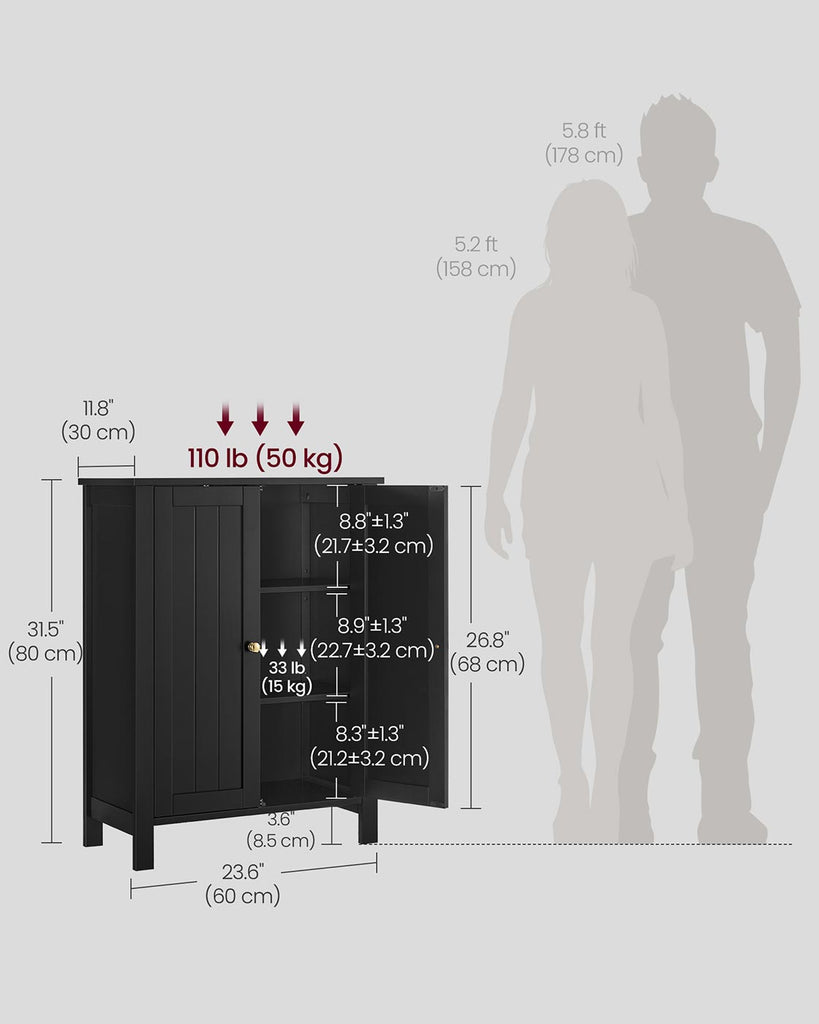 Color: Ink Black Material: MDF (Medium Density Fiberboard) Product Size: 11.8"D x 23.6"W x 31.5"H (30 x 60 x 80 cm) Product Weight: 28.7 lb (13 kg) Max. Static Load Capacity of the Tabletop: 110 lb (50 kg) Max. Static Load Capacity of Each Adjustable Shelf: 33 lb (15 kg) Package Contents: 1 x Bathroom Floor Cabinet 1 x Accessory Bag 1 x Anti-Tip Kit 1 x Instructions