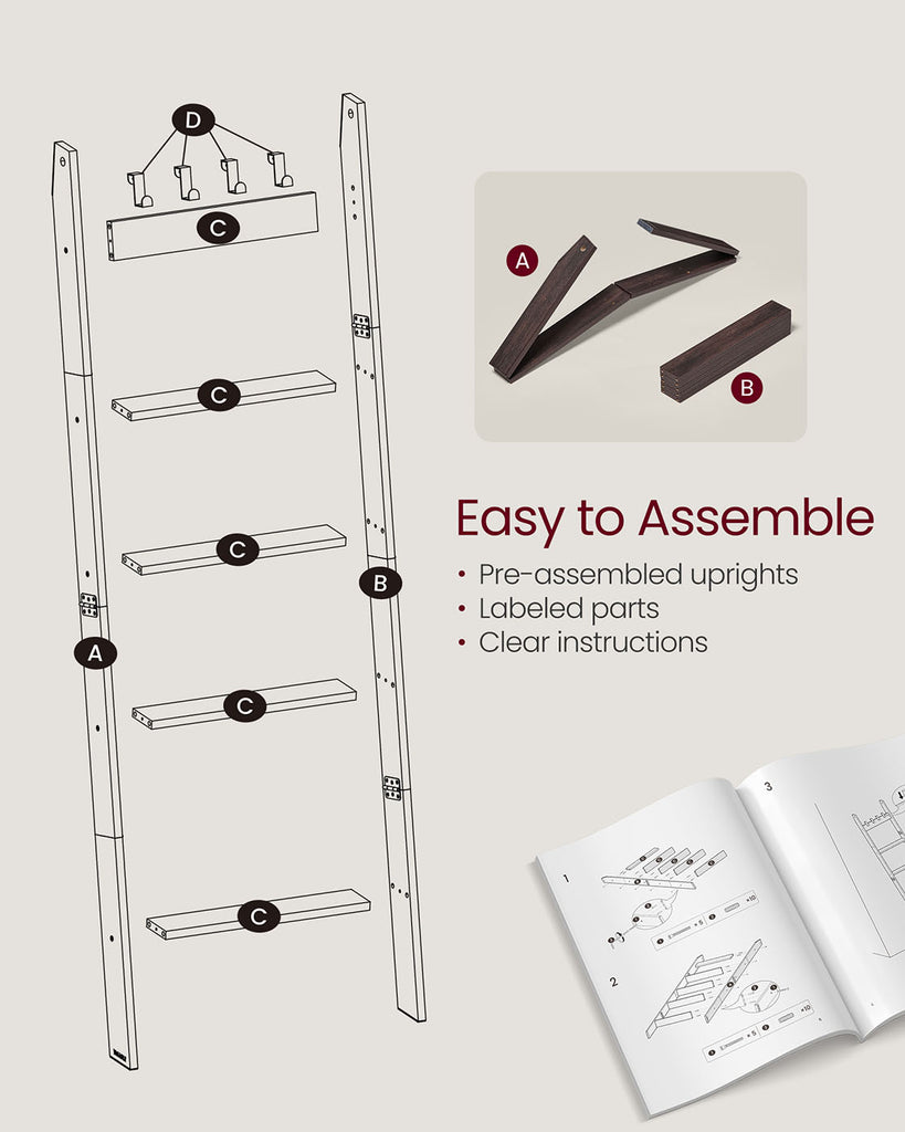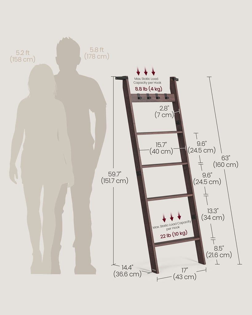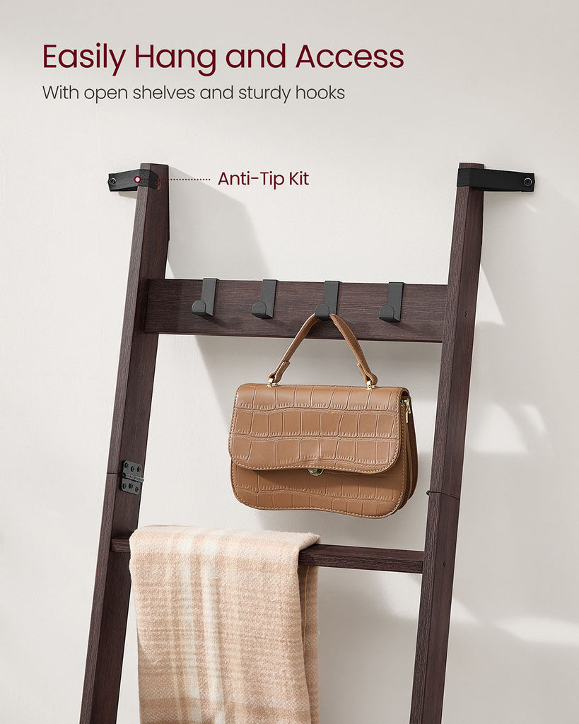 Blanket Ladder 5-Tier Ladder Shelf 4 Removable Hooks Maroon Brown