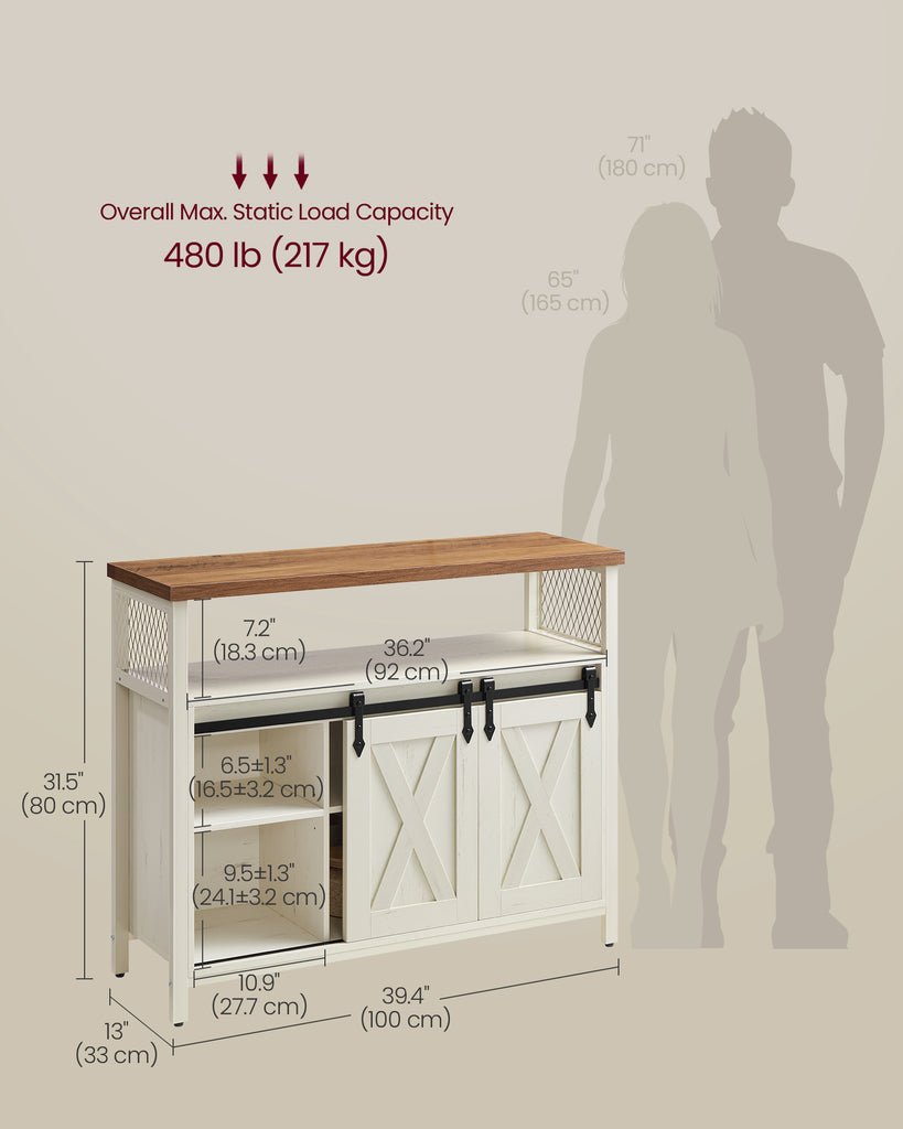Specifications: Color: Cloud White, Honey Brown Material: Steel, Particleboard Product Size: 13"D x 39.4"W x 31.5"H (33 x 100 x 80 cm) Product Weight: 56.4 lb (25.6 kg) Max. Static Load Capacity of the Surface: 175 lb (79 kg) Max. Static Load Capacity of Each Open Shelf: 66 lb (30 kg) Max. Static Load Capacity per Adjustable Shelf: 40 lb (18 kg) Package Contents: 1 x Sideboard 1 x Accessory Kit 1 x Anti-Tip Kit 1 x Instructions