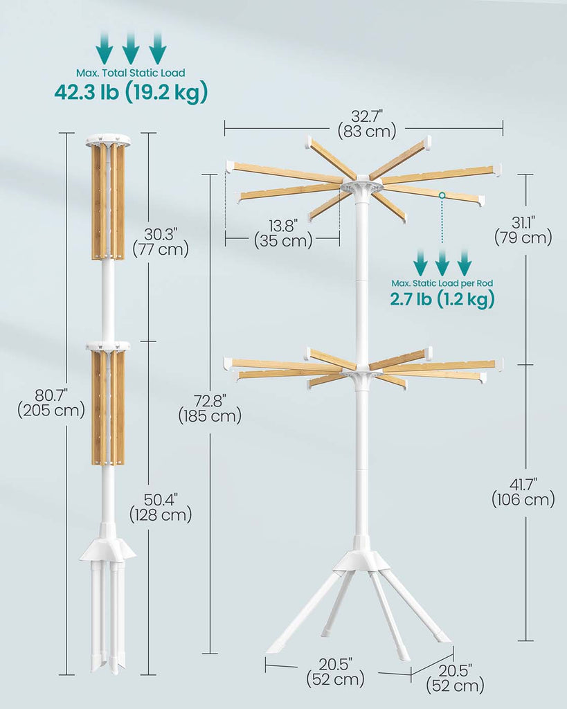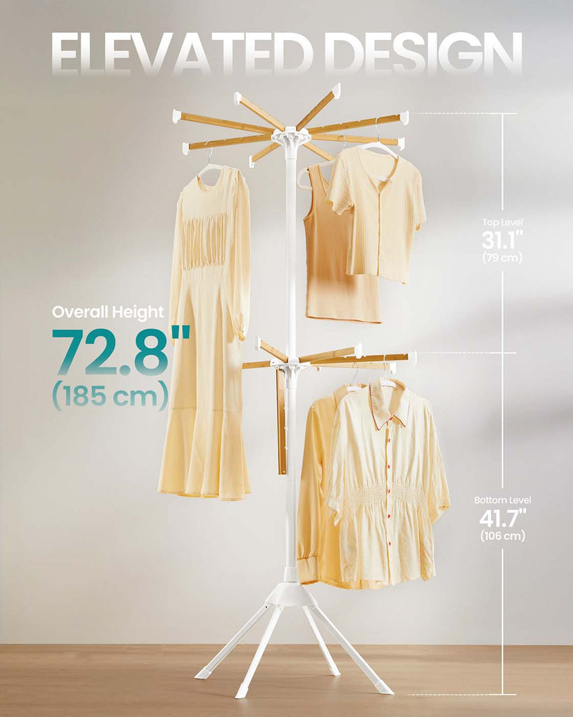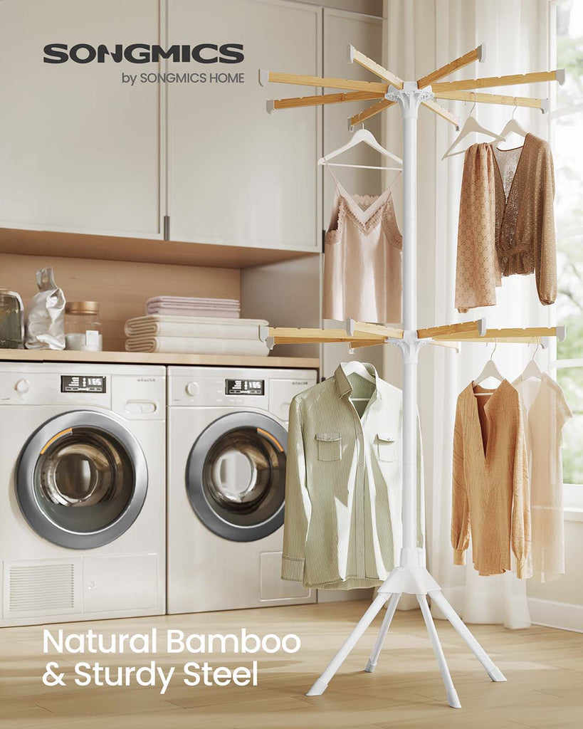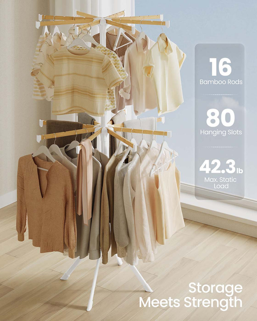 Effortless Laundry Solutions Transform your laundry routine with our 2-tier drying rack, engineered for optimal capacity and ease. Capable of holding up to 60 garments and supporting 42.3 lb, it effortlessly accommodates long items like jeans and dresses. With a height of 71.2 inches and a robust 4-leg design, it offers enhanced stability and durability, complemented by elegant bamboo rods. Perfect for Compact Living Designed for small spaces, this foldable drying rack assembles swiftly without any tools. Its collapsible bamboo rods and innovative grooved design ensure hangers remain securely in place, while non-slip foot pads provide added stability. Easily disassemble and store it, making it a functional tool for efficient drying in compact living environments. Specifications: Color: White, Natural Material: Steel, Bamboo Product Size: 32.7"D x 32.7"W x 72.8"H (83 x 83 x 185 cm) Product Weight: 6.9 lb (2.9 kg) Max. Static Load Capacity per Rod: 2.7 lb (1.2 kg) Max. Total Static Load Capacity: 42.3 lb (19.2 kg) Package Contents: 1 x Drying Rack Notes: This drying rack holds up to 42.3 lb (19.2 kg). Do not overload it. Please hang your clothes on the rack evenly to maintain balance.