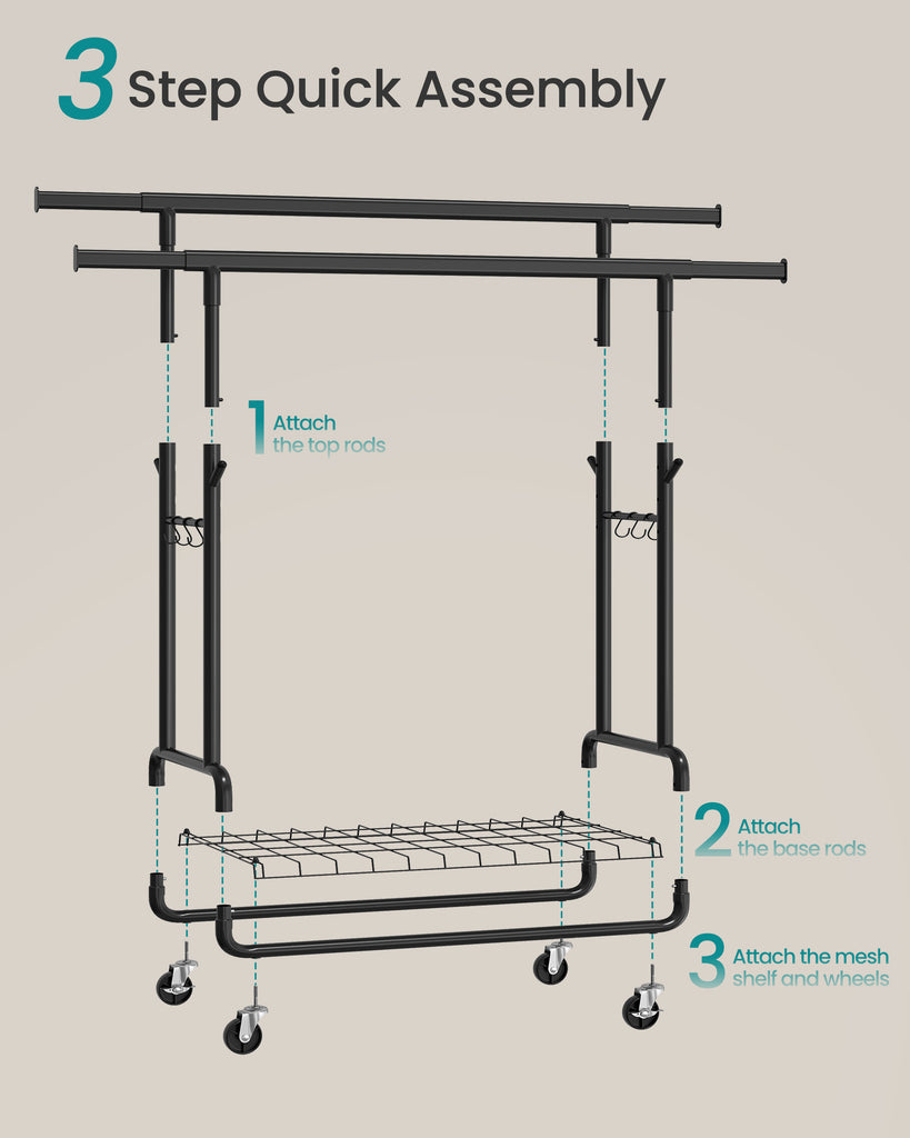 The Highlights of This Clothes Rack at a Glance: Sturdy construction: Premium steel tubing and one-piece hanging rods ensure strong support and resists bending under heavy loads. Versatile storage: This clothing rack features double hanging rods, S-hooks, and a bottom shelf to keep clothes, bags, and shoes organized. Extendable and Adjustable: Extendable hanging rods, each with 3 height options, fit all storage needs. Easy assembly & storage: Simple 4-step setup and effortless disassembly for compact storage. Smooth mobility: Four 360 wheels (2 with brakes) let you move and lock the rack easily. Specifications: Color: Ink Black Material: Steel Product Size: 20.7"D x (42.1"-59")W x (56.8"-64.6")H (52.5 x 107-149.8 x 144.2-164.2 cm) Product Weight: 20 lb (9.1 kg) Max. Static Load Capacity per Hanging Rod: 220 lb (100 kg) Max. Static Load Capacity of the Bottom Shelf: 110 lb (50 kg) Max. Static Load Capacity per Branch-Shaped Hook: 11 lb (5 kg) Max. Total Static Load Capacity: 594 lb (270 kg) Max. Total Dynamic Load Capacity: 369.6 lb (168 kg) Package Contents: 1 x Clothes Rack 6 x S-Hook 1 x Instructions Notes: Distribute weight evenly and do not exceed static load capacity. When the clothes rack is fully loaded, it is recommended to move this rack slowly and with the assistance of other people to help prolong its service life.