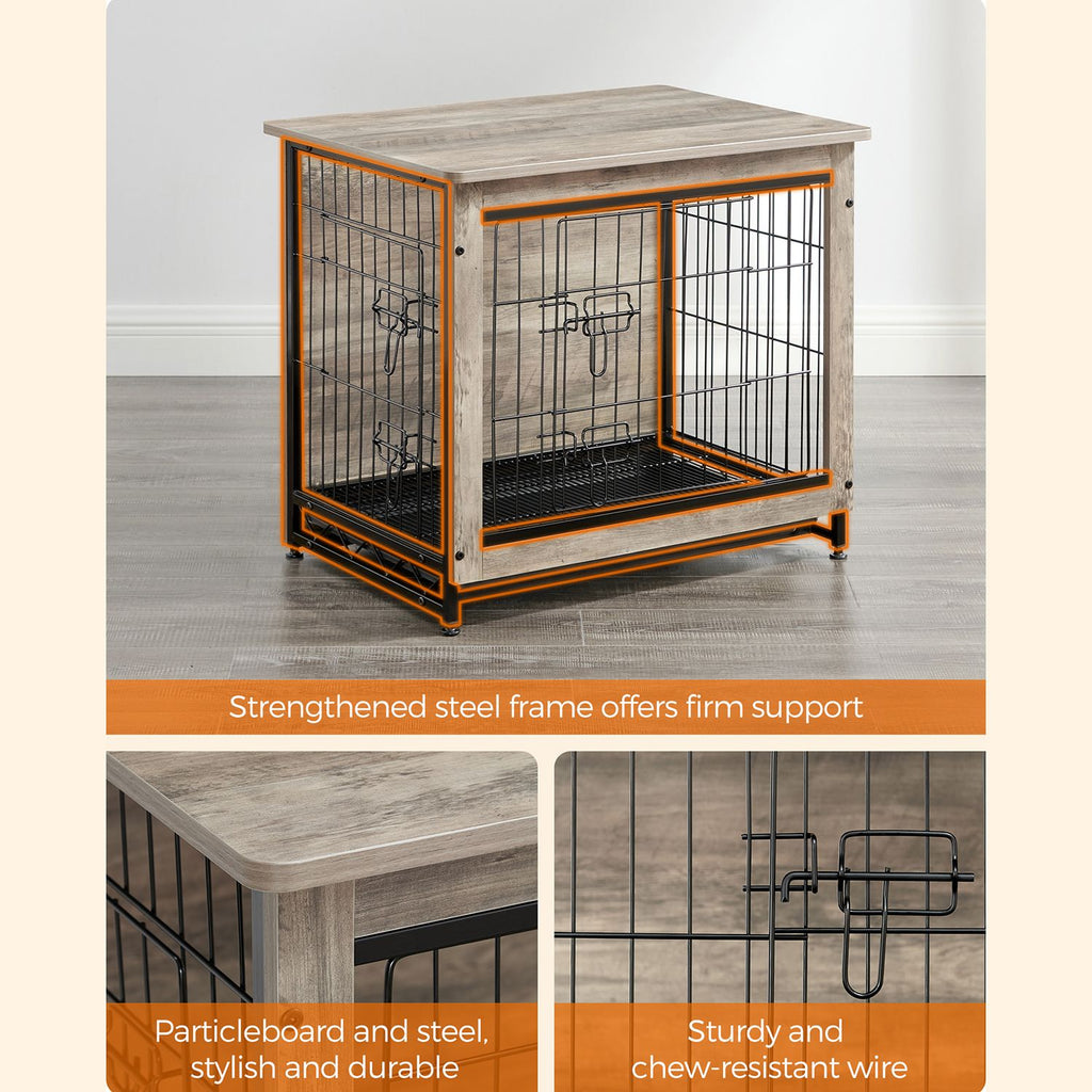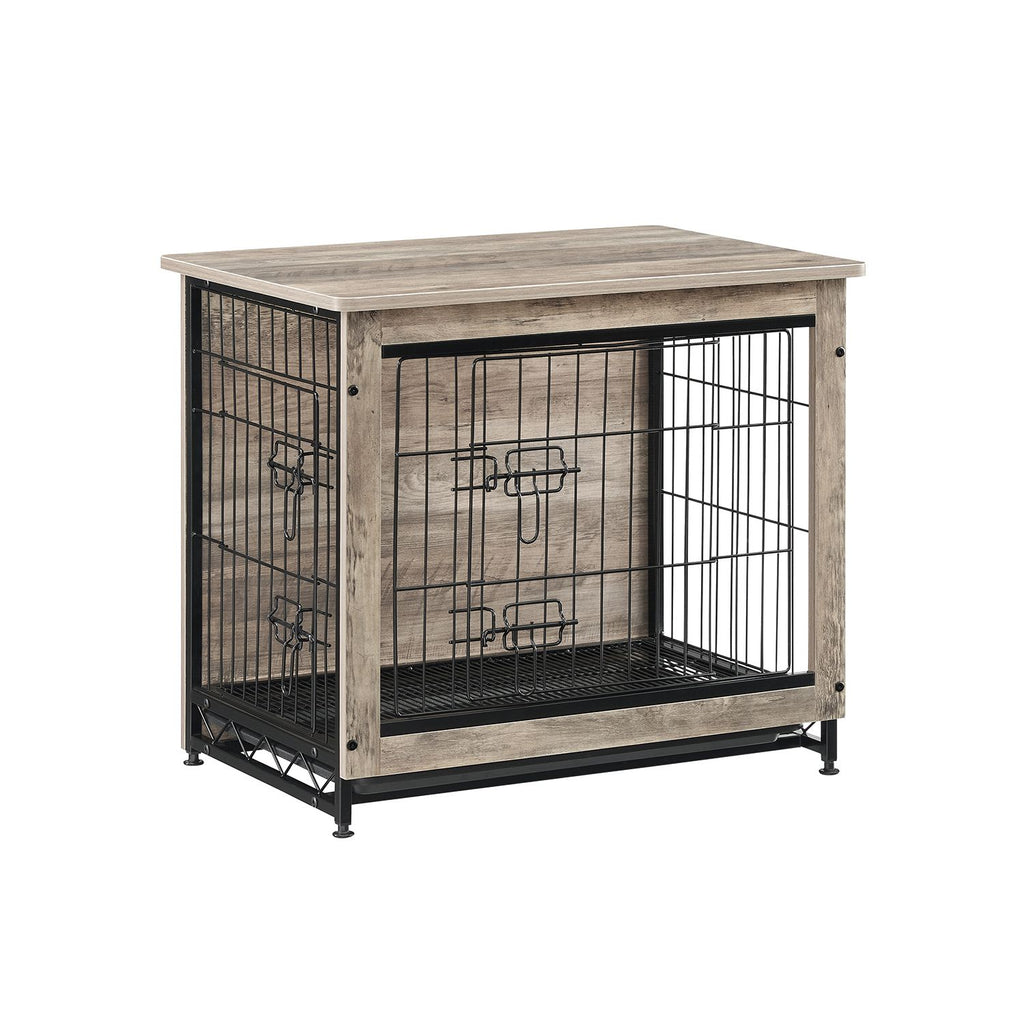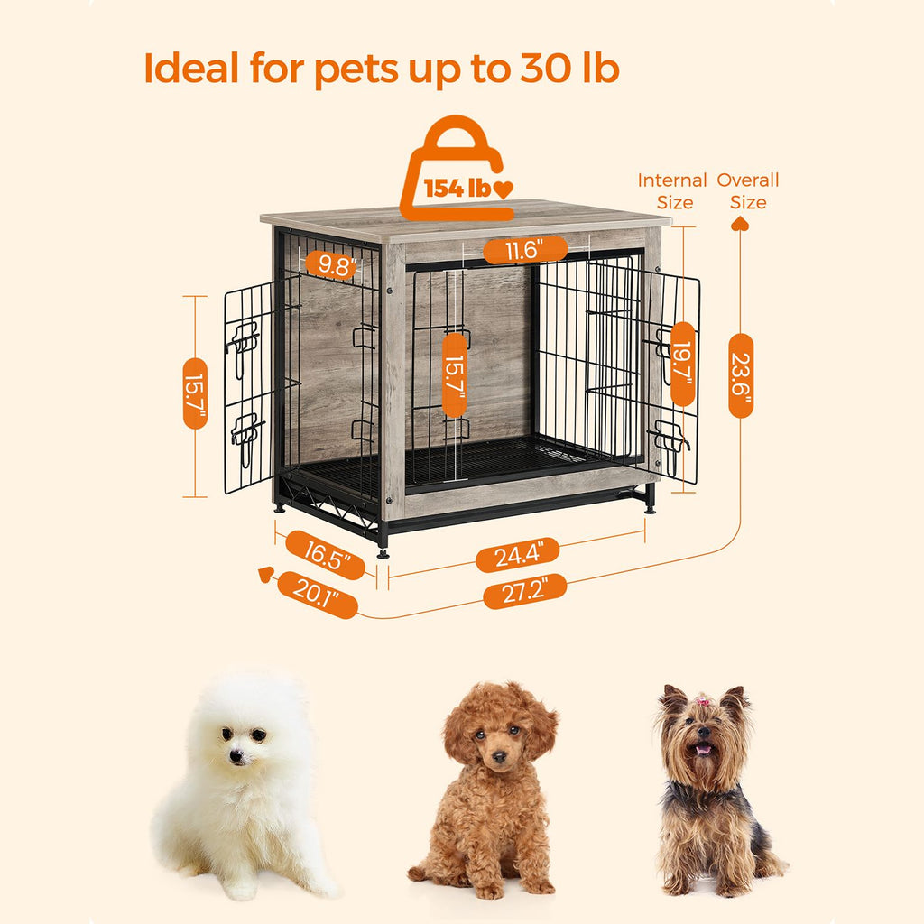 Specifications:- Color: Greige- Material: Particleboard, Steel- Overall Product Size: 27.2”L x 20.1”W x 23.6”H (69 x 51 x 60 cm)- Inner Size: 24.4”L x 16.5”W x 19.7”H (62 x 42 x 50 cm)- Product Weight: 33.5 lb (15.2 kg)- Max. Static Load Capacity of the Top: 154 lb (70 kg)Package Contents:- 1 x Dog Crate- 1 x InstructionsFEANDREA Notes:- To keep your fur friend safe, always remove its collar before it enters any crate.- To choose the right crate size, please measure the size, including length and height, of your fur friend first, and add 4 inches to both final measurements for moving and being comfortable.- Please keep an eye on your children and don’t let them climb into or play in or on the product.