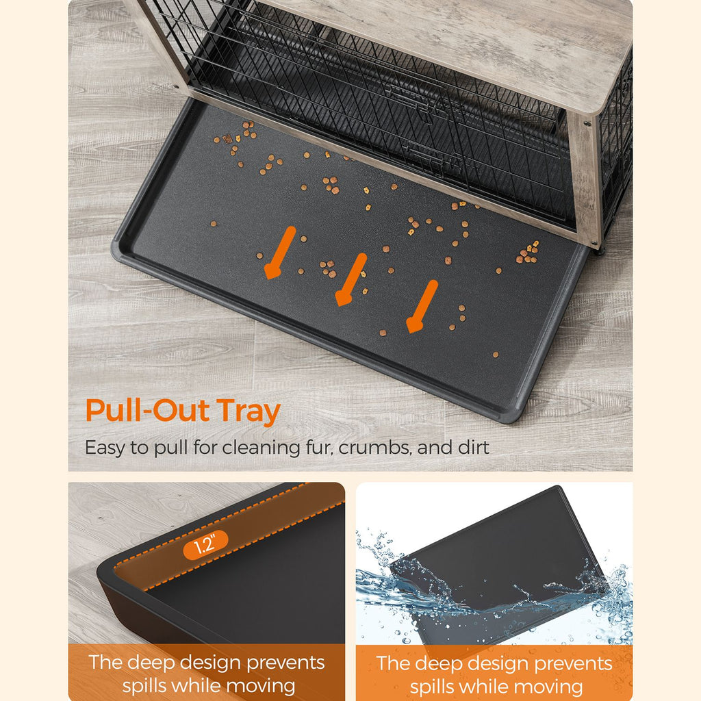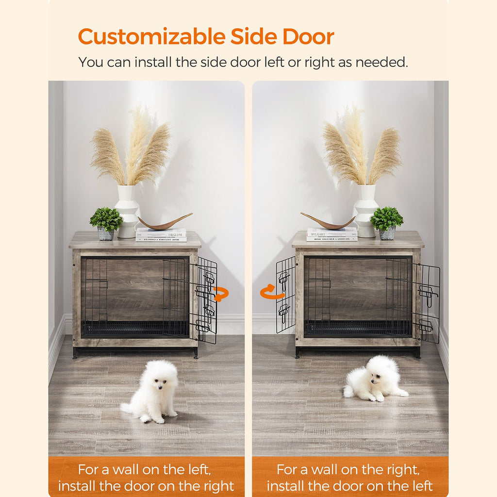 When Should You Use a Dog Crate? - If your dog needs a retreat of its own to rest and relax. - If your dog tends to destroy your home when you’re away. - If your dog is afraid of strangers and needs a place to feel safe. Why Choose this Furniture-Style Dog Crate? - Easily blends in your home: With a rustic finish, it elevates your space. - Works for you, too: With a spacious top, it doubles as an end table or bedside table. - Customizable to fit your space: The side door can be installed either on the left or right. - Quality materials: Made with particleboard and steel, it’s strong and durable. - Easy assembly: Straightforward instructions and numbered parts help you assemble it within 30 mins. - Easy to clean: A pull-out tray and water-resistant veneered surface make cleaning a breeze.