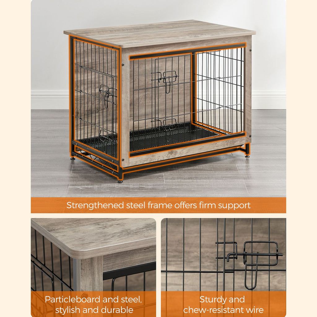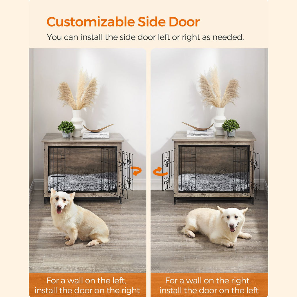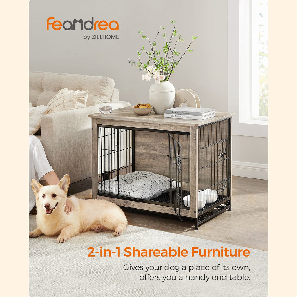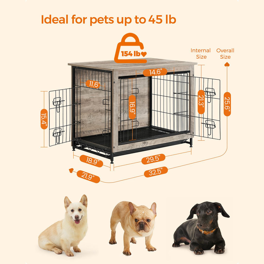 Specifications:- Color: Greige- Material: Particleboard, Steel- Overall Product Size: 32.5”L x 21.9”W x 25.2”H (82.5 x 55.5 x 64 cm)- Inner Size: 29.9”L x 18.5”W x 21.3”H (76 x 47 x 54 cm)- Product Weight: 40.7 lb (18.5 kg)- Max. Static Load Capacity of the Top: 154 lb (70 kg)Package Contents:- 1 x Dog Crate- 1 x InstructionsFEANDREA Notes:- To keep your fur friend safe, always remove its collar before it enters any crate.- To choose the right crate size, please measure the size, including length and height, of your fur friend first, and add 4 inches to both final measurements for moving and being comfortable.- Please keep an eye on your children and don’t let them climb into or play in or on the product.