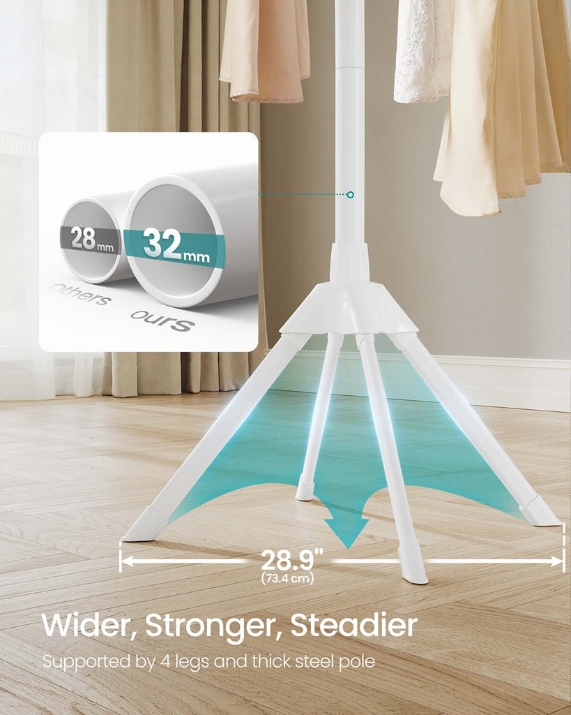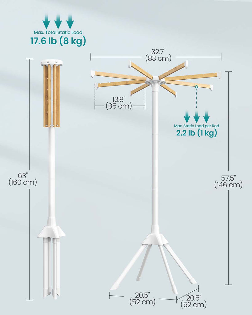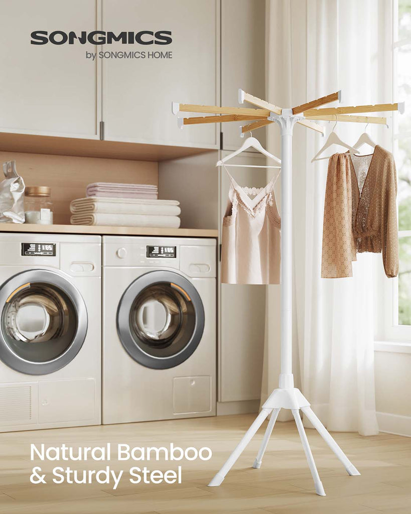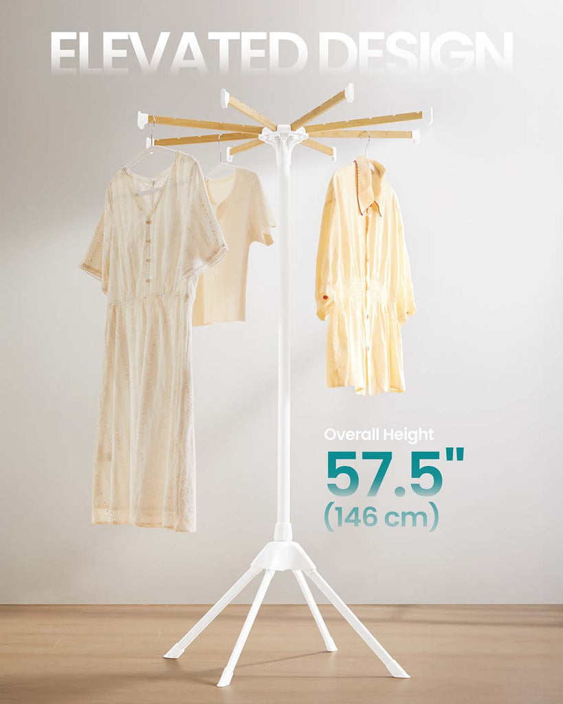 Effortless Laundry Solutions Transform your laundry routine with our drying rack, engineered for optimal capacity and ease. Capable of holding up to 30 garments and supporting 17.6 lb, it effortlessly accommodates long items like jeans and dresses. With a height of 57.5 inches and a robust 4-leg design, it offers enhanced stability and durability, complemented by elegant bamboo rods. Perfect for Compact Living Designed for small spaces, this foldable drying rack assembles swiftly without any tools. Its collapsible bamboo rods and innovative grooved design ensure hangers remain securely in place, while non-slip foot pads provide added stability. Easily disassemble and store it, making it a functional tool for efficient drying in compact living environments. Specifications: - Color: White, Natural - Material: Steel, Bamboo - Product Size: 32.7"D x 32.7"W x 57.5"H (83 x 83 x 146 cm) - Product Weight: 4.6 lb (2.1 kg) - Max. Static Load Capacity per Rod: 2.2 lb (1 kg) - Max. Total Static Load Capacity: 17.6 lb (8 kg) Package Contents: - 1 x Drying Rack Notes: - This drying rack holds up to 17.6 lb (8 kg). Do not overload it. - Please hang your clothes on the rack evenly to maintain balance.
