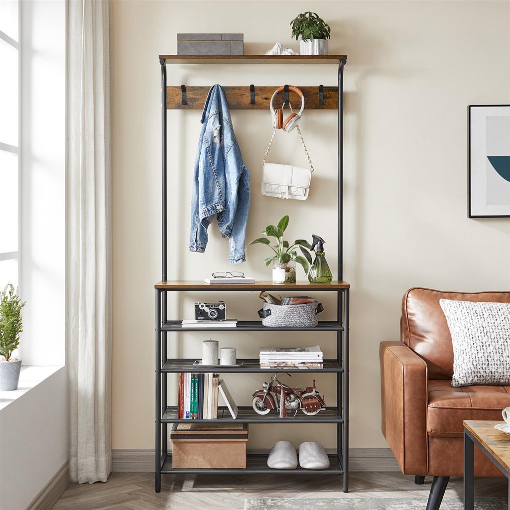 Industrial Coat Rack Keep items neatly organized to quickly grab before heading out. All-in-One Storage Unit A top shelf, five hooks, and a four-tier shoe rack with a handy particleboard shelf offer ample storage to create a tidy home. Spacious Shoe Rack Five shoe shelves at varying heights allow you to accommodate your different types of shoes neatly. Added Stability Adjustable feet keep it balanced even on slightly uneven floors. The anti-tip kit enhances safety and stability.