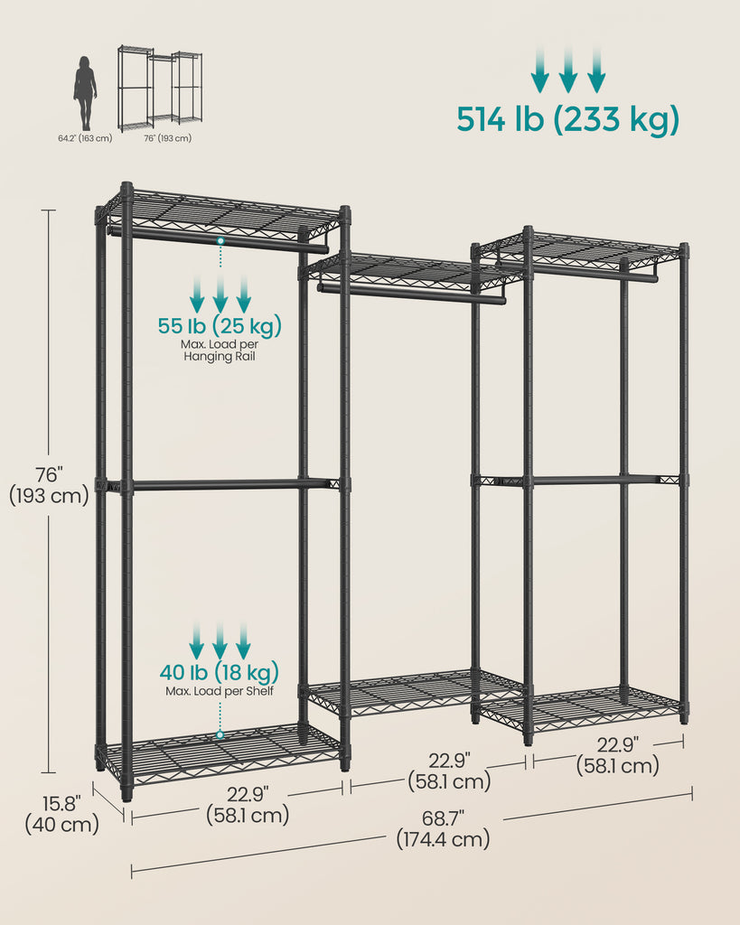 Color: Ink Black Material: Steel Product Size: 68.7"L x 15.8"W x 76"H (174.4 x 40 x 193 cm) Product Weight: 31.6 lb (14.4 kg) Max. Static Load Capacity per Hanging Rail: 55 lb (25 kg) Max. Static Load Capacity per Shelf: 40 lb (18 kg) Overall Max. Static Load Capacity: 514 lb (233 kg) Package Contents: 1 x Portable Closet 1 x Accessory Kit 1 x Anti-Tip Kit 1 x Instructions