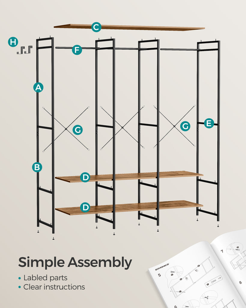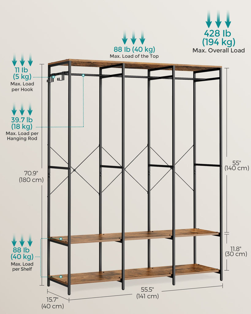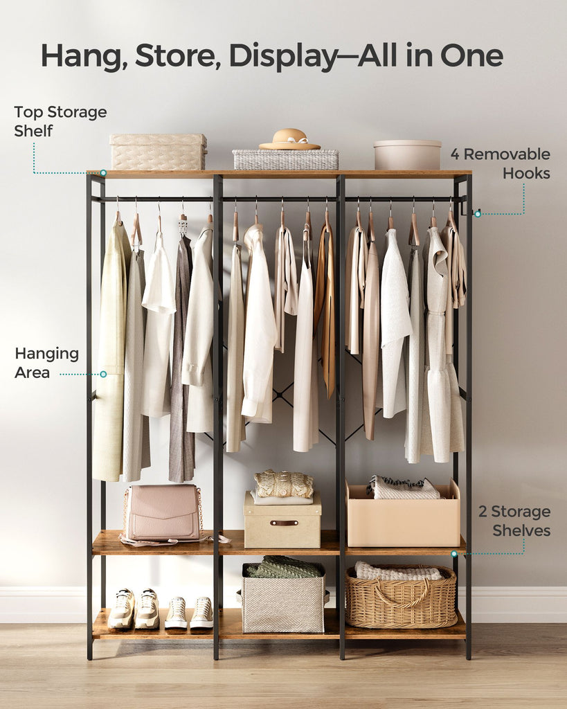 Iron and Wood Clothes Rack with Hanging Rods, Closet Shelves, Removable Hooks