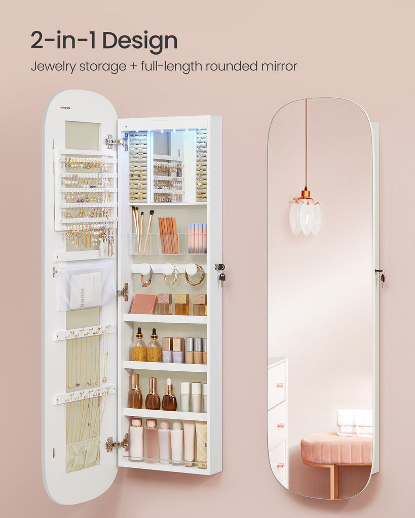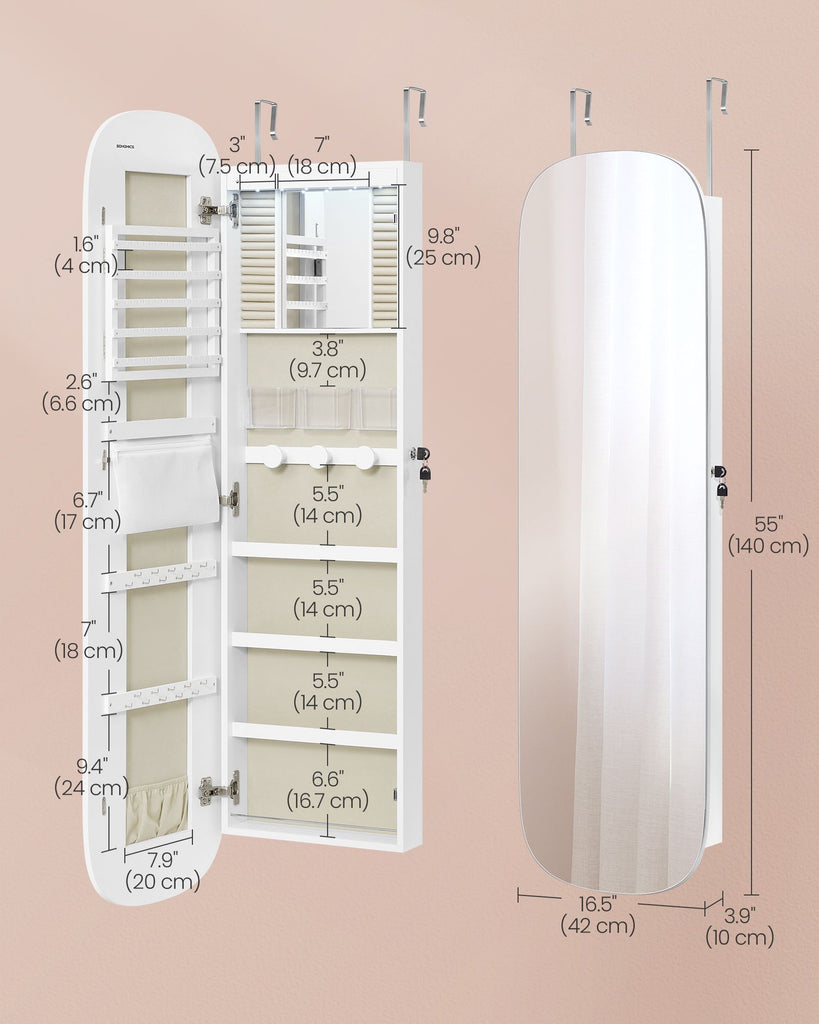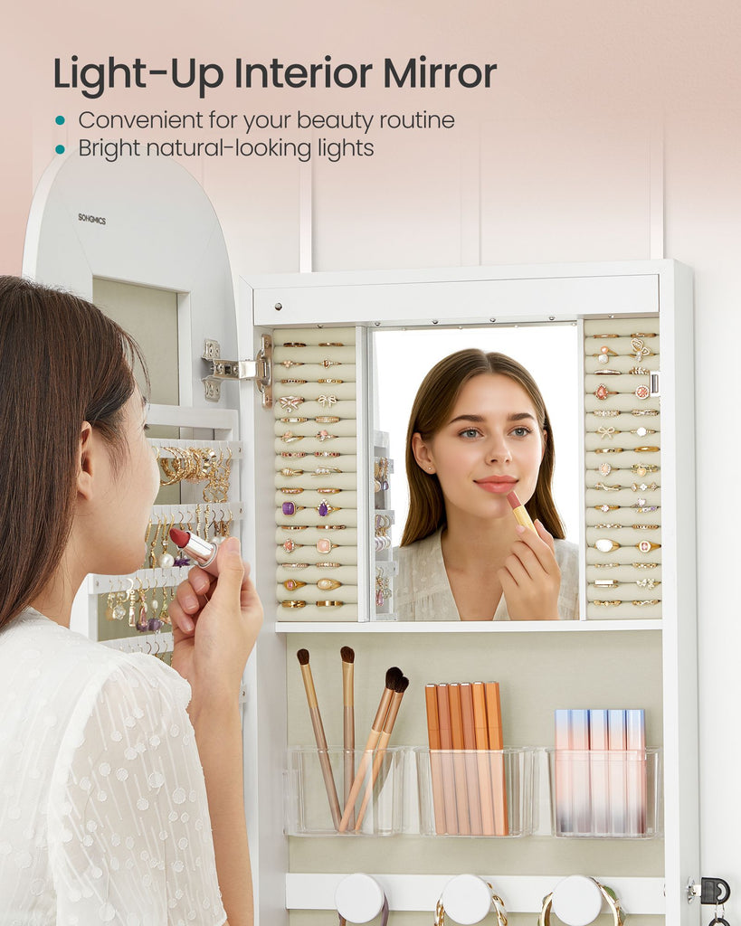 Jewelry Organizer, LED Jewelry Cabinet Wall/Door Mounted, 3.9 x 16.5 x 55 Inches, White Surface with Greige Lining