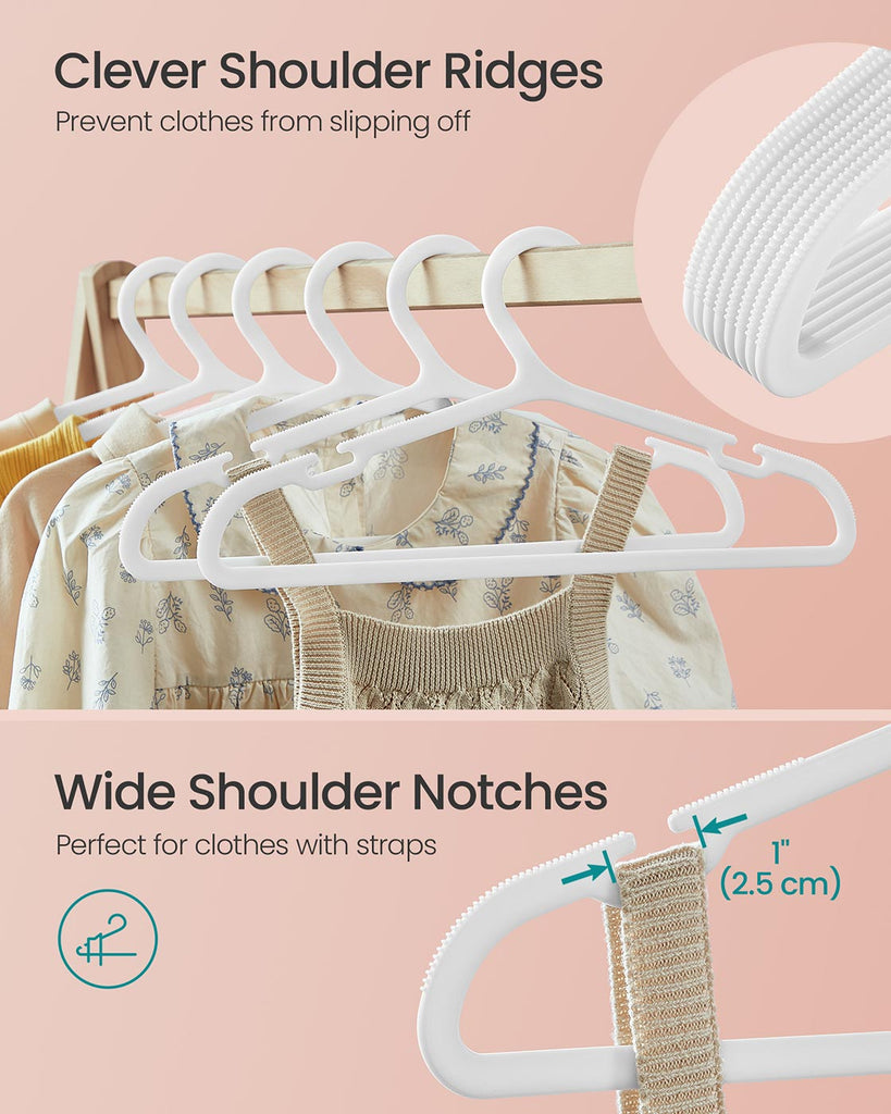 Perfectly Sized for Little Wardrobes These youth hangers are just right for your young one's clothing, from newborn onesies to toddler tees. Designed to preserve the shape of clothes without stretching, they ensure that even the tiniest outfits stay looking their finest. Maximize Closet Space with Slim Design Say goodbye to disorganized closets! These plastic hangers, each at just 3 mm thick, help you make the most of your closet space. Perfect for organizing those adorable infant clothes and making room for more cute outfits. Specifications: Color: Cloud White Material: Plastic Size per Hanger: 14"W x 7"H (35 x 17.5 cm) Total Weight of 100 Hangers: 6.5 lb (3 kg) Max. Static Load Capacity per Hanger: 5.5 lb (2.5 kg) Package Contents: 100 x Kids Hanger Notes: Do not overload the kids hangers with heavy items. Do not use the children's clothes hangers in a dryer.