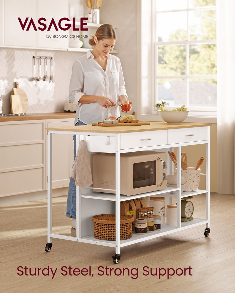 Easy to Move, Easy to Secure: Relocate your kitchen island in seconds with 4 swivel casters. 2 casters with brakes allow you to lock it firmly in place when needed, providing peace of mind during busy kitchen tasks. Strength and Sophistication Combined: Constructed from robust steel and premium panels, this kitchen island cart is built to last. Its minimalist design and sleek lines create a contemporary focal point in your kitchen. Specifications: - Color: Oak Beige, Matte White - Material: Particleboard, MDF (Medium Density Fiberboard), Steel - Product Size: 27.6"D x 43.3"W x 35.4"H (70 x 110 x 90 cm) - Product Weight: 62 lb (28.1 kg) - Max. Static Load Capacity Total: 648 lb (294 kg) - Max. Static Load Capacity of the Worktop: 330.7 lb (150 kg) - Max. Static Load Capacity of the Large Shelf: 66.1 lb (30 kg) - Max. Static Load Capacity of the Small Shelf: 33.1 lb (15 kg) - Max. Static Load Capacity of the Bottom Shelf: 165.3 lb (75 kg) - Max. Static Load Capacity of Each Drawer: 15.4 lb (7 kg) - Max. Static Load Capacity of Each Hook: 11 lb (5 kg) Package Contents: - 1 x Kitchen Island - 1 x Accessory Kit - 1 x Instructions Notes: - Do not stand on or sit on the kitchen island. - Do not exceed its load capacity.