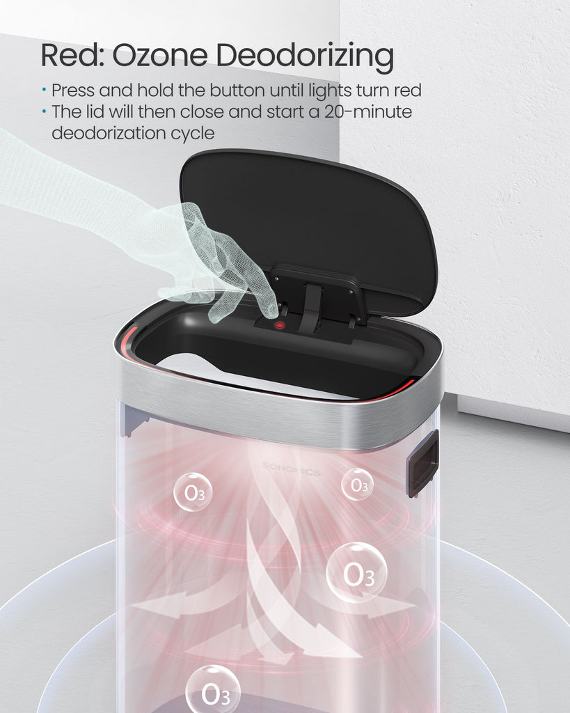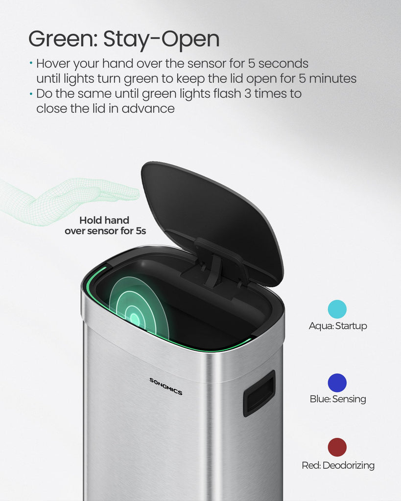 Kitchen Trash Can, 17.2-Gallon (65 L) Motion Sensor Garbage Can, Stainless Steel Trash Bin, Ozone Odor Control, Stay-Open, Metallic Silver