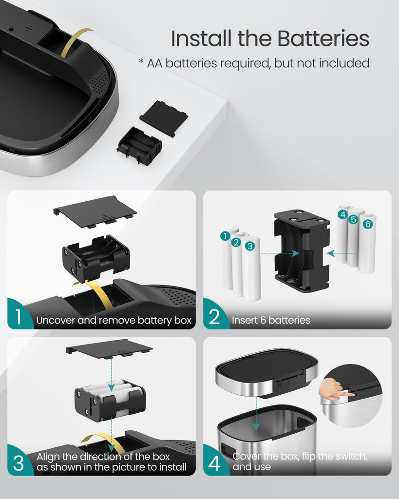 Color: Metallic Silver Material: Stainless Steel Bin, ABS Plastic Lid Product Size: 17.3L x 11.8W x 24.8H (44 x 30 x 63 cm) Height with Lid Open: 34.2" (87 cm) Volume: 17.2 Gallons (65 L) Product Weight: 9.2 lb (4.2 kg) Package Contents: 1 x Trash Bin 15 x Liner Bag