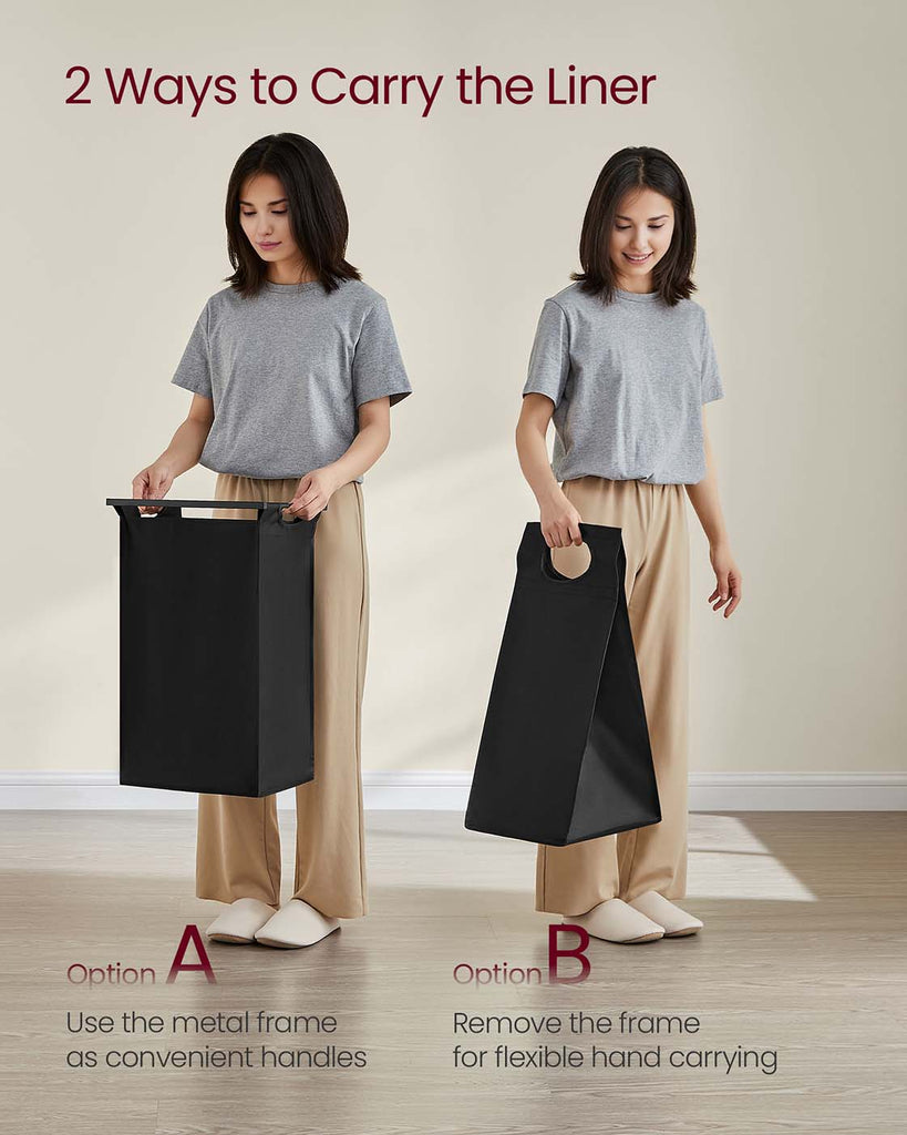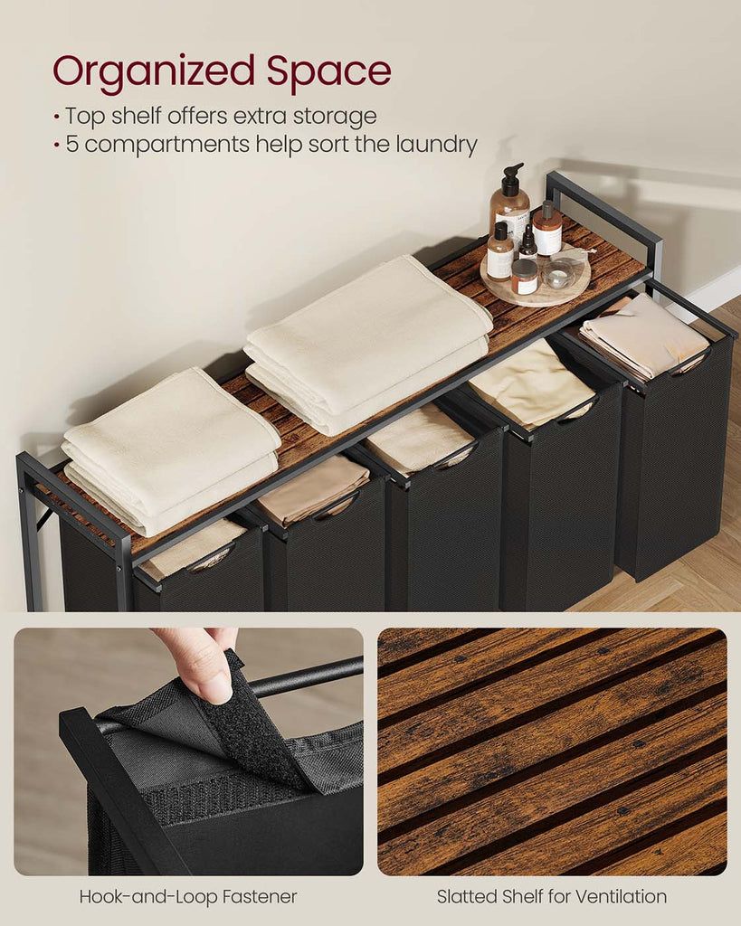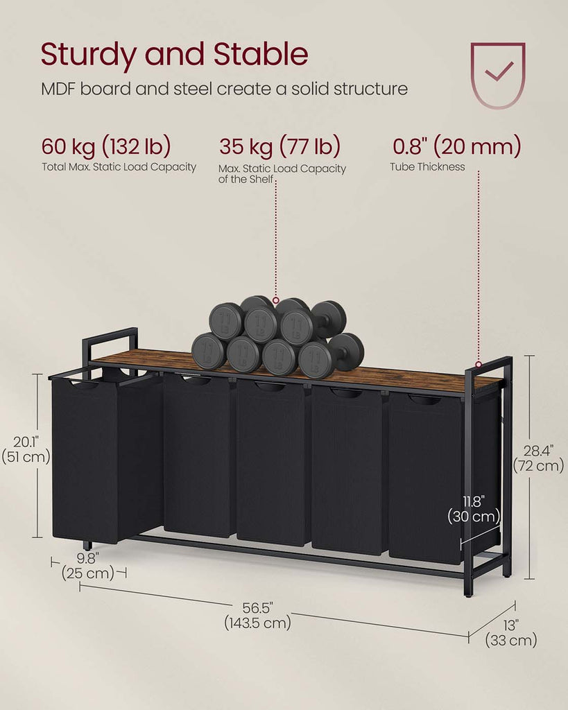 Specifications: - Color: Ink Black, Rustic Brown - Material: MDF (Medium Density Fiberboard), Steel, Oxford Fabric - Product Size: 56.5"L x 13"W x 28.4"H (143.5 x 33 x 72 cm) - Size of Each Liner: 11.8"L x 9.8"W x 20.1"H (30 x 25 x 51 cm) - Product Weight: 24.3 lb (11 kg) - Max. Static Load Capacity Total: 132 lb (60 kg) - Max. Static Load Capacity of Each Liner: 11 lb (5 kg) - Max. Static Load Capacity of the Shelf: 77 lb (35 kg) Package Contents: - 1 x Laundry Hamper - 2 x Anti-Tip Kit - 1 x Accessory Bag - 1 x Instructions Notes: - Please secure the laundry basket to the wall with the provided anti-tip kit to ensure safe use. - Do not sit on the laundry sorter as it may tip over. - To prevent finger pinching, please be careful when pulling out or pushing in the laundry basket. - The fabric liners are not machine-washable.