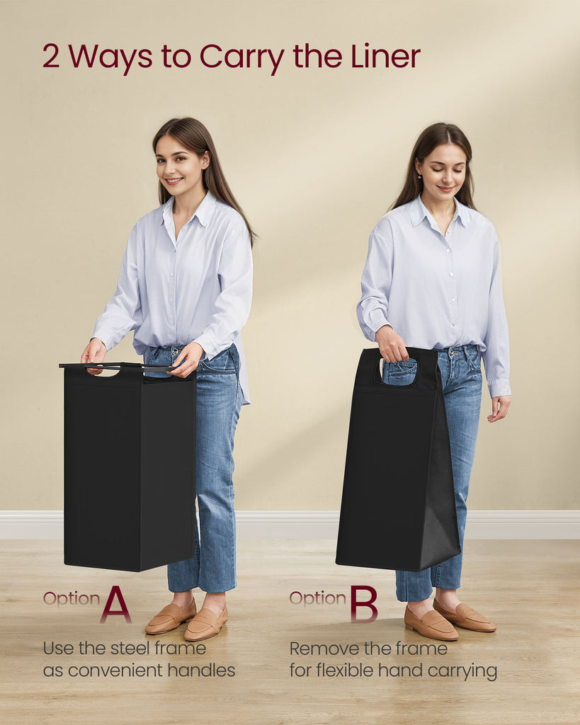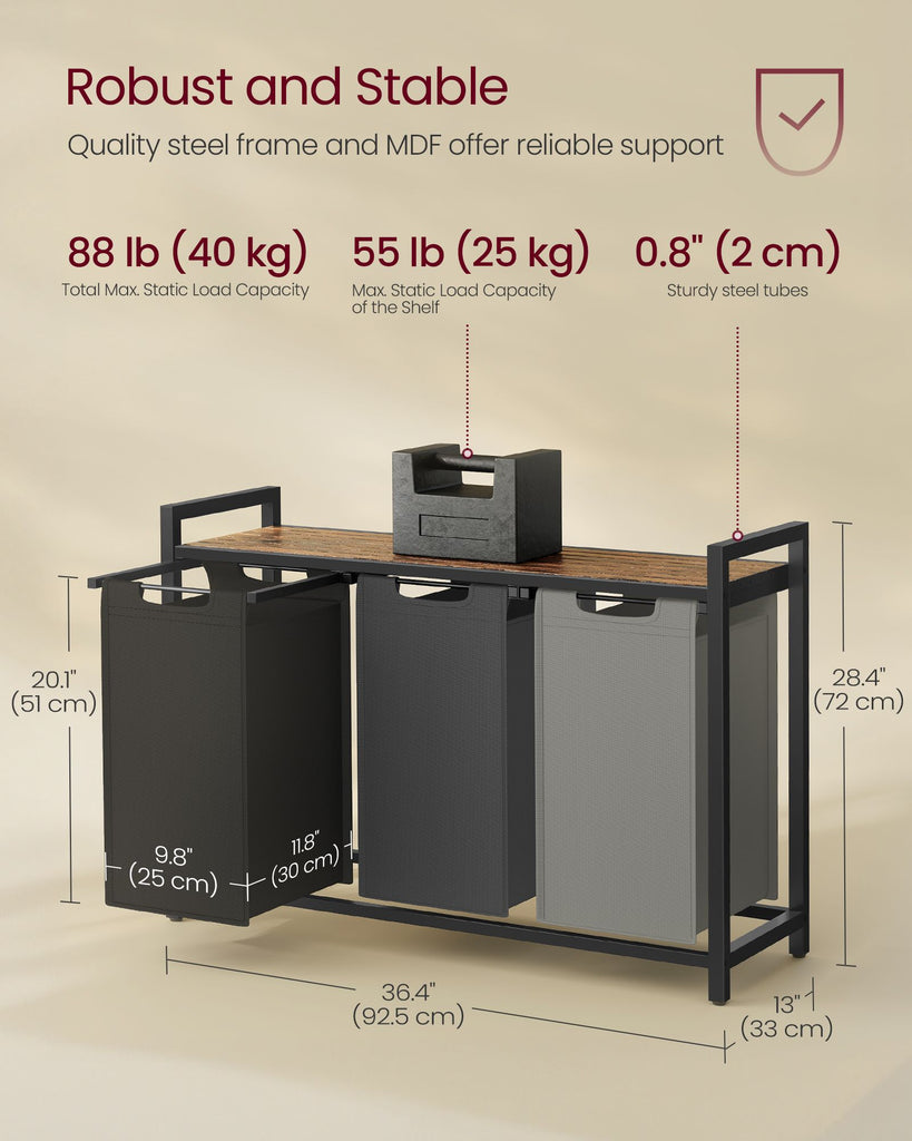Specifications: Color: Ink Black, Slate Gray, Dove Gray, Rustic Brown Material: MDF (Medium Density Fiberboard), Steel, Oxford Fabric Product Size: 36.4"L x 13"W x 28.4"H (92.5 x 33 x 72 cm) Size of Each Liner: 9.8"L x 11.8"W x 20.1"H (25 x 30 x 51 cm) Product Weight: 17.9 lb (8.1 kg) Max. Static Load Capacity Total: 88 lb (40 kg) Max. Static Load Capacity of Each Liner: 11 lb (5 kg) Max. Static Load Capacity of the Shelf: 55 lb (25 kg) Package Contents: 1 x Laundry Hamper 2 x Anti-Tip Kit 1 x Accessory Bag 1 x Instructions Notes: Please secure the laundry basket to the wall with the provided anti-tip kit to ensure safe use. Do not sit on the laundry sorter as it may tip over. To prevent finger pinching, please be careful when pulling out or pushing in the laundry basket. The fabric liners are not machine-washable.