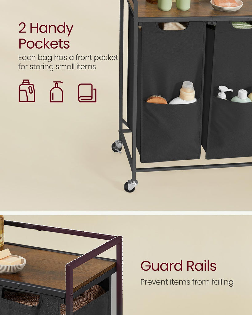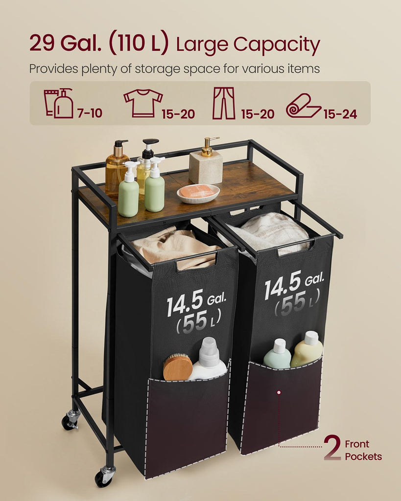 Tired of chaotic laundry days? This laundry sorter transforms chaos into order, making laundry day a breeze. Its spacious design and practical features take convenience to the next level. Highlights at a glance: - Large Capacity: With a capacity of up to 29 gallons, you can store all your laundry in one place. - Practical Top Shelf: Perfect for detergents, toiletries, and other small items. - Easy to Move and Lock: 4 wheels, 2 of which are lockable. - Removable Laundry Bags: With hook-and-loop fasteners, the bags are removable for easy laundry transport. - Robust & Sturdy: Made of thick steel tubes and quality particleboard, it can hold up to 79.2 lb. - Water-Resistant Oxford Fabric: Easy to clean with a damp cloth. Specifications: - Colour: Ink Black, Rustic Brown - Material: Particleboard, Steel, Oxford Fabric - Product Size: 24.8"L x 12.6"W x 36.6"H (63 x 32 x 93 cm) - Product Weight: 12.1 lb (5.5 kg) - Max. Static Load Capacity of Top Shelf: 44 lb (20 kg) - Max. Static Load Capacity of Each Bag: 17.6 lb (8 kg) - Max. Static Load Capacity Total: 79.2 lb (36 kg) Package Contents: - 1 x Laundry Hamper - 1 x Accessory Kit - 1 x Instructions Notes: - If liquid spills on the top shelf, wipe dry with a cloth immediately. - Do not store sharp objects in this laundry sorter to avoid damage or injury. - The maximum static load capacity of this laundry sorter is 79.2 lb. Do not overload it.