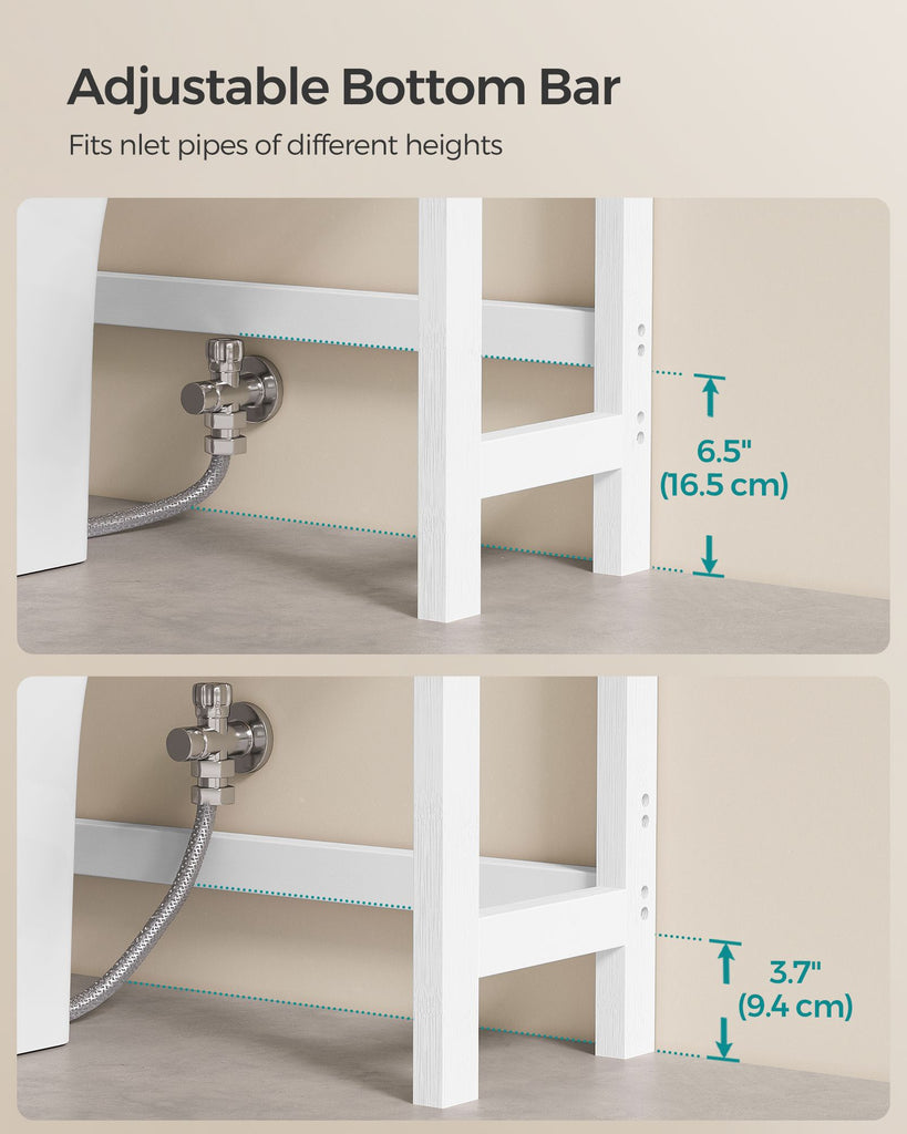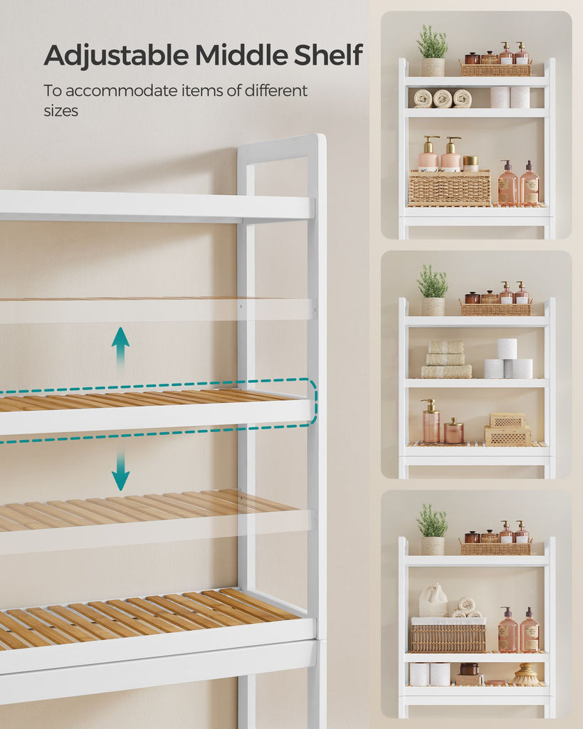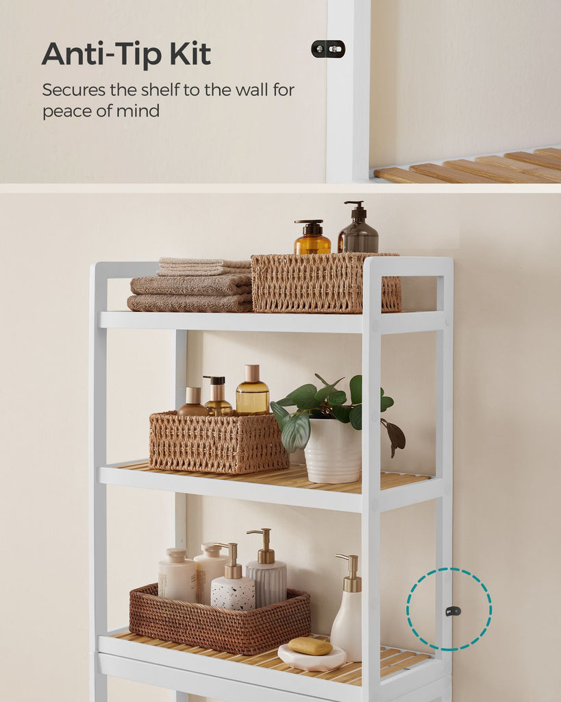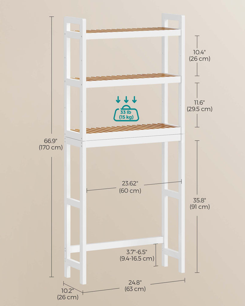 Color: Simply White, Natural Beige Material: Bamboo Product Size: 10.2"D x 24.8"W x 66.9"H (63 x 26 x 170 cm) Product Weight: 14.3 lb (6.5 kg) Max. Static Load Capacity per Shelf: 33 lb (15 kg) 1 x Over-the-Toilet Organizer 1 x Accessory Kit 1 x Anti-Tip Kit 1 x Instructions