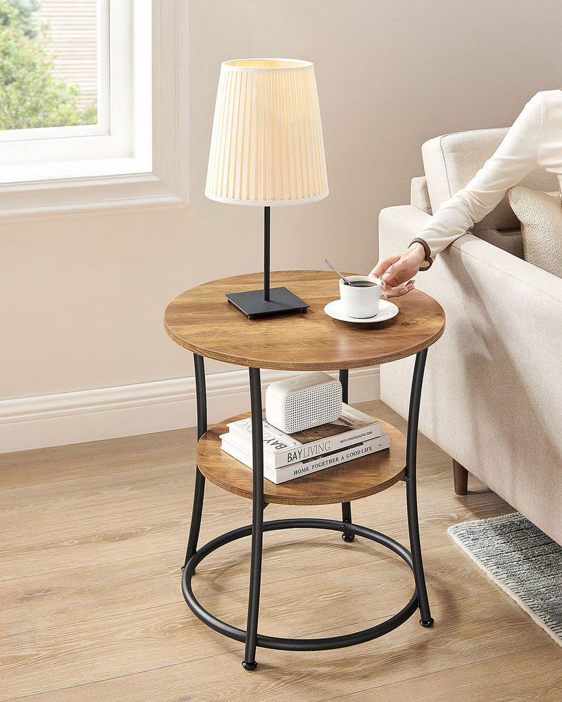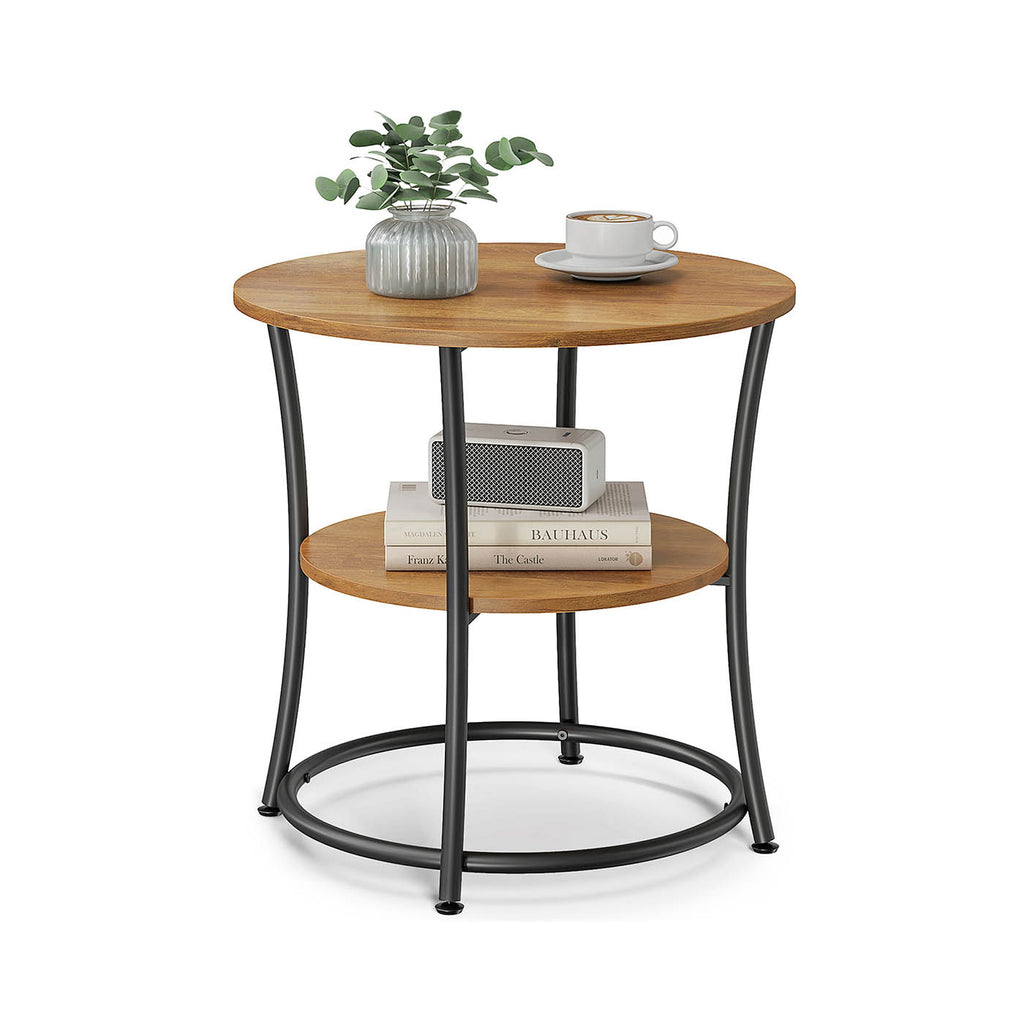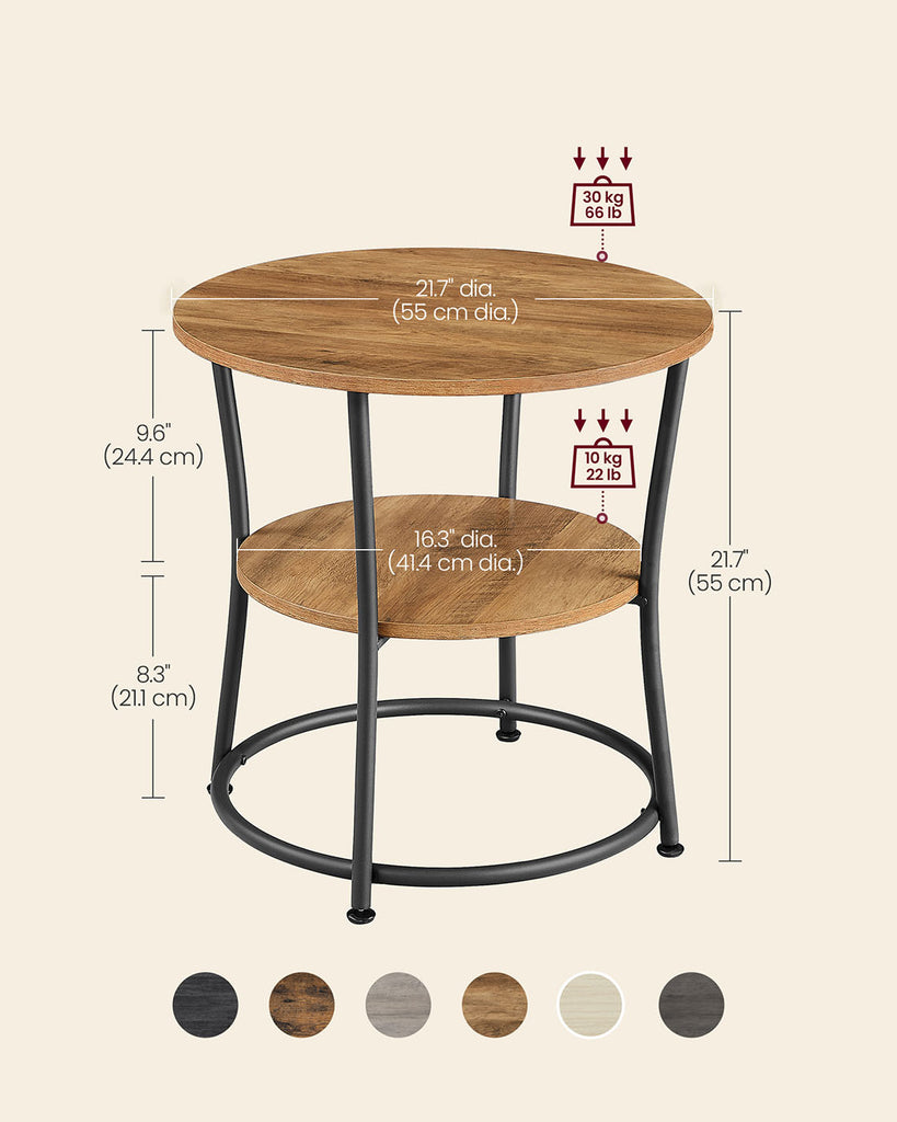 Specifications: - Color: Rustic Walnut, Black - Material: Particleboard, Steel - Product Size: 21.7”Dia. x 21.7”H (55 x 55 cm) - Product Weight: 13.4 lb (6.1 kg) - Max. Static Load Capacity of Tabletop: 66 lb (30 kg) - Max. Static Load Capacity of Bottom Shelf: 22 lb (10 kg) Package Contents: - 1 x Side Table - 1 x Assembly Kit - 1 x Instructions